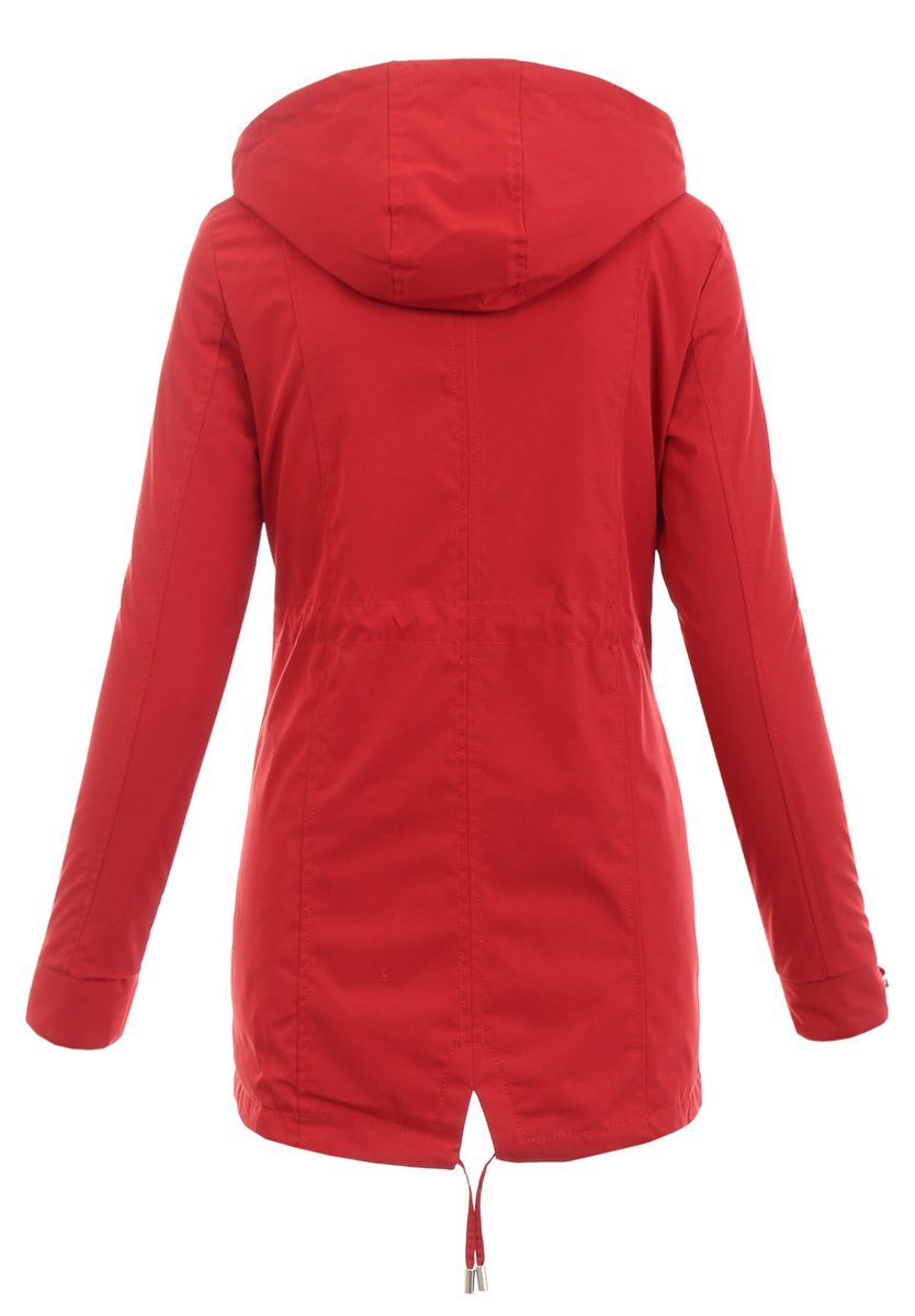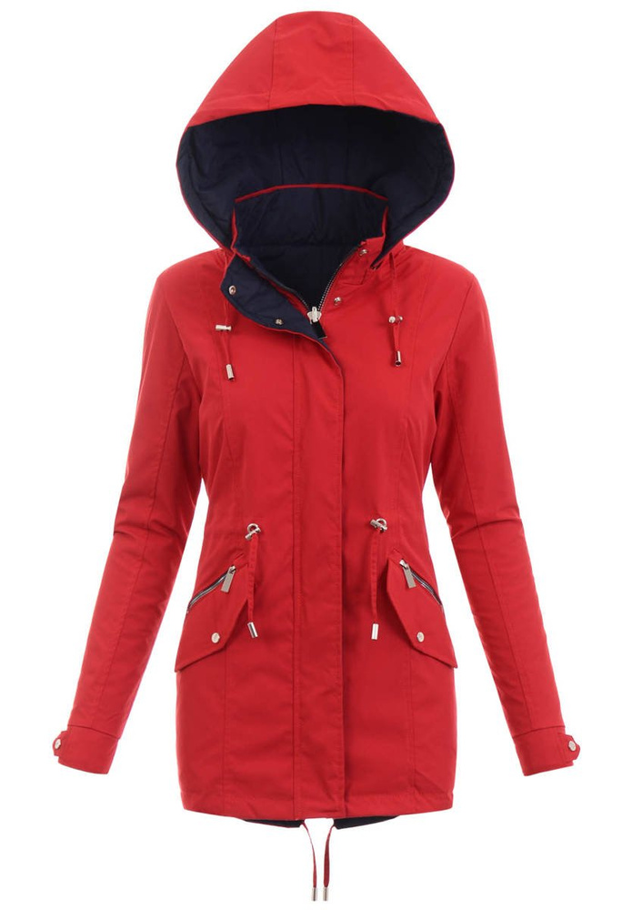 Dwustronna kurtka parka wiosenna w kolorze czerwono granatowym. Kurtka zasuwana jest na suwak i zapinana na napy. Regulowane mankiety kurtki są jej dodatkowym atutem i dodają oryginalności. Parka posiada dwie kieszenie zasuwane na suwak oraz dwie atrapy kieszeni zapinane na napę. Dodatkowego kurtka posiada ściągacz w pasie oraz na dole, który pozwala na dopasowanie kurtki do sylwetki. Odpinany kaptur ze ściągaczem zapewnia ciepło podczas chłodniejszych i deszczowych dni. Parka idealnie sprawdza się do wiosennych i jesiennych stylizacji. Kurtka lekko ocieplana, tył dłuższy o ok 4 cm. Materiał: 100% Poliester.