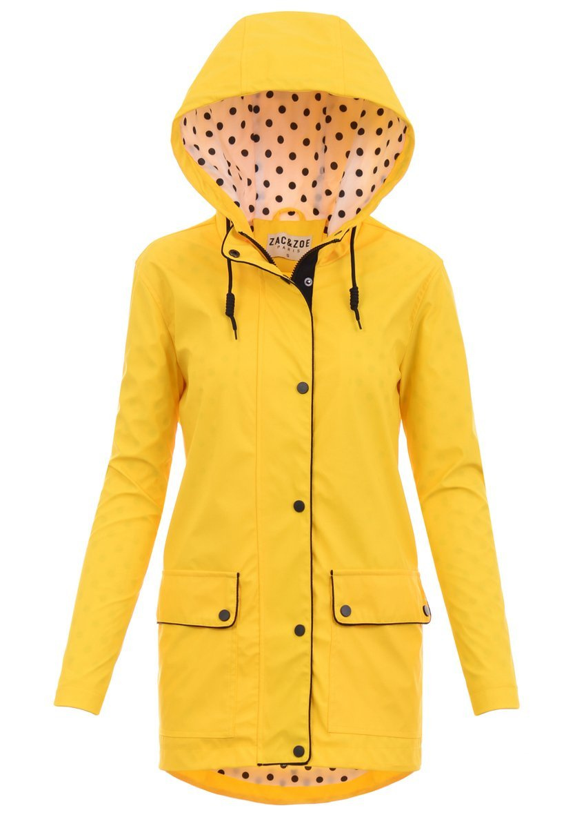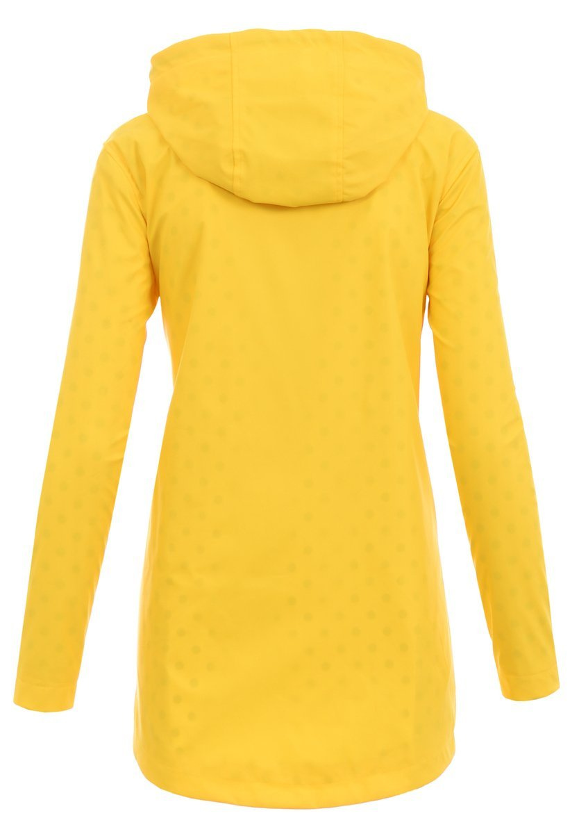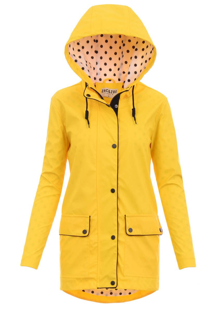 Damski wiosenny przeciwdeszczowy płaszcz, wykonany z gumo-podobnego materiału. Kurtka w oryginalnym żółtym kolorze. Płaszcz zapinany jest na suwak oraz napy i posiada dwie pojemne kieszenie zapinane również na napy. Oryginalności dodaje kurtce nieodpinany kaptur ze ściągaczem podszyty białym materiałem w czarne kropki. Wiatrówka idealnie sprawdzi się podczas deszczowych i chłodnych wiosennych oraz jesiennych dni. Tył dłuższy o ok 6 cm.