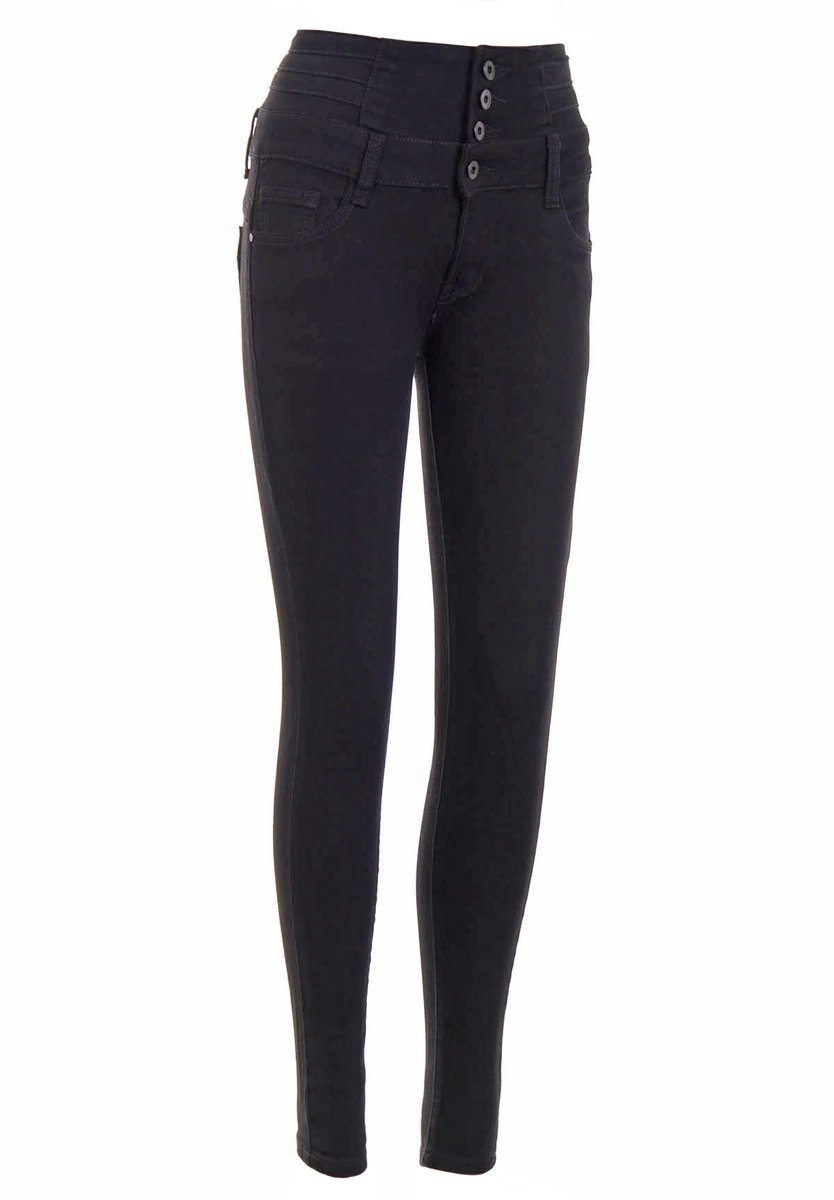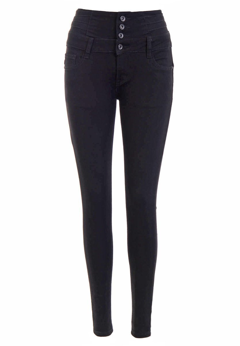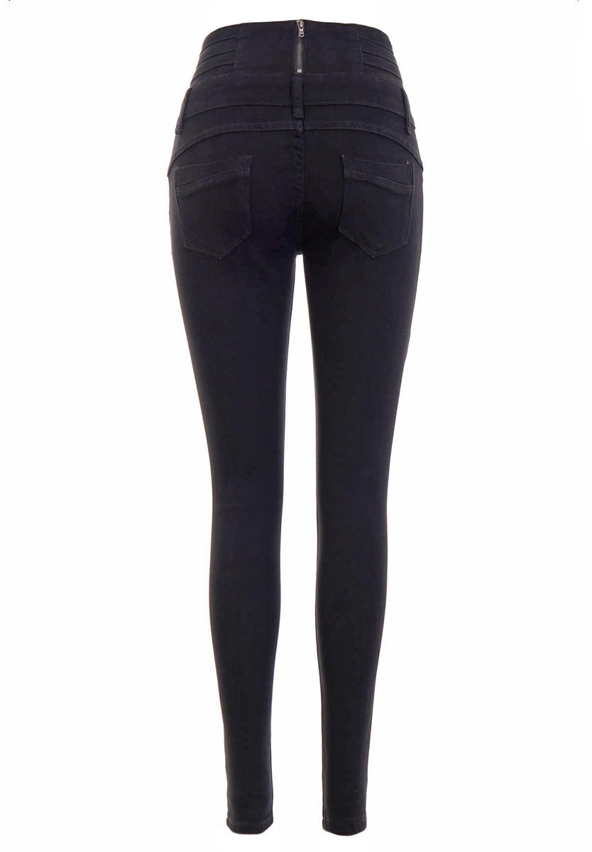 Damskie spodnie w kolorze czarnym. Dodatkowego uroku dodaje jeansom ozdobny suwak znajdujący się z tyłu spodni. Spodnie mają dwie kieszenie z przodu i z tyłu oraz malutką kieszeń z przodu. Spodnie zapinane są na guziki oraz suwak, posiadają szlufki w pasie. Spodnie wykonane są z uciągliwego materiału najwyższej jakości. Skład: 95% Bawełna; 5% Elastan.