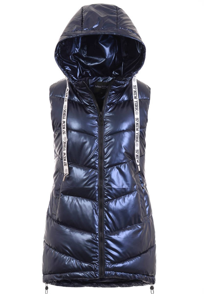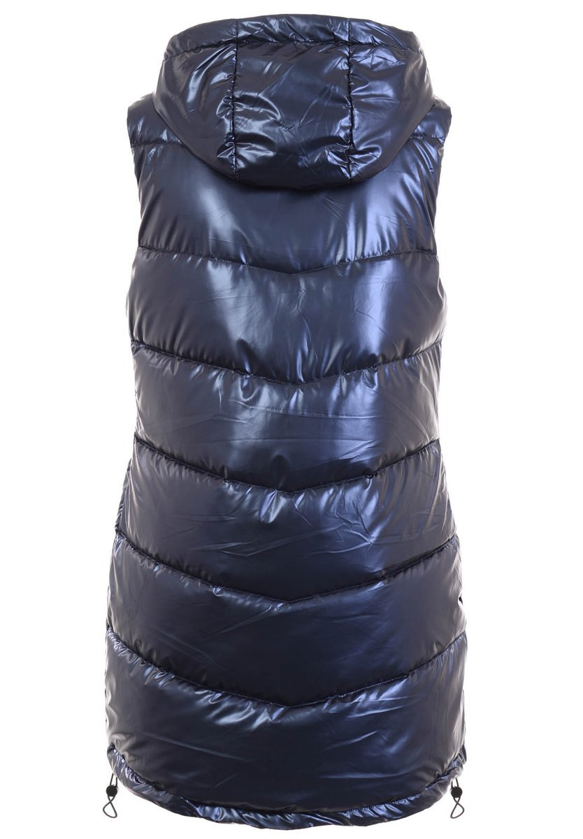 Bardzo modna, długa kamizelka w kolorze granatowym. Modny krój i nieszablonowy, metalizujący kolor sprawia, że bezrękawnik idealnie sprawdza się w wielu wiosennych oraz jesiennych stylizacjach. Delikatne ocieplenie oraz kaptur ze ściągaczem zapewnia ciepło w chłodniejsze dni oraz ochronę przed wiatrem i deszczem. Tył dłuższy o ok. 11 cm.