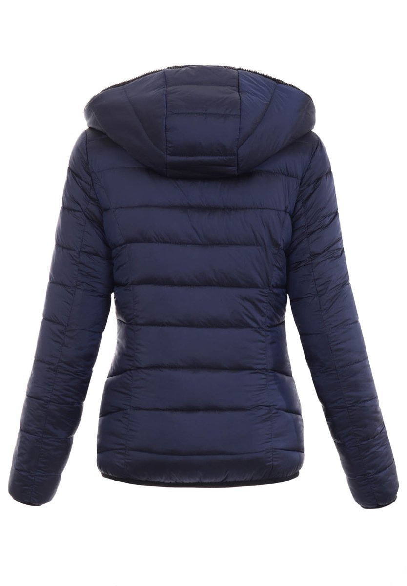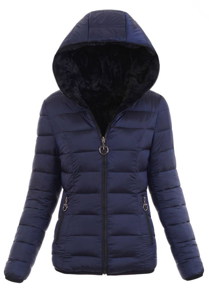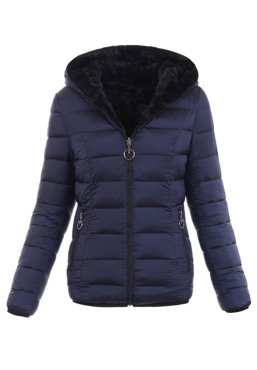 Nowoczesna, bardzo modna kurtka damska w kolorze granatowym. Kurtka na całej długości łącznie z rękawami wykończona jest przyjemnym w dotyku futerkiem w kolorze czarnym. Dodatkowym atutem kurtki jest możliwość założenia jej na drugą stronę, futerkiem do góry. Kurtka zasuwana jest na suwak oraz posiada z przodu dwie praktyczne kieszenie zasuwane na suwaki. Nieodpinany kaptur wykończony futerkiem zapewnia idealną ochronę przed wiatrem i deszczem w wietrzne zimowe dni. Na dole kurtki oraz w mankietach rękawów znajduje się ściągacz. Kurtka wykonana jest z materiałów najwyższej jakości. dodatkowo kurtka ocieplona jest bardzo wysokiej jakości wypełnieniem syntetycznym, które zapewnia doskonałą termoizolację oraz wysoki komfort użytkowania.