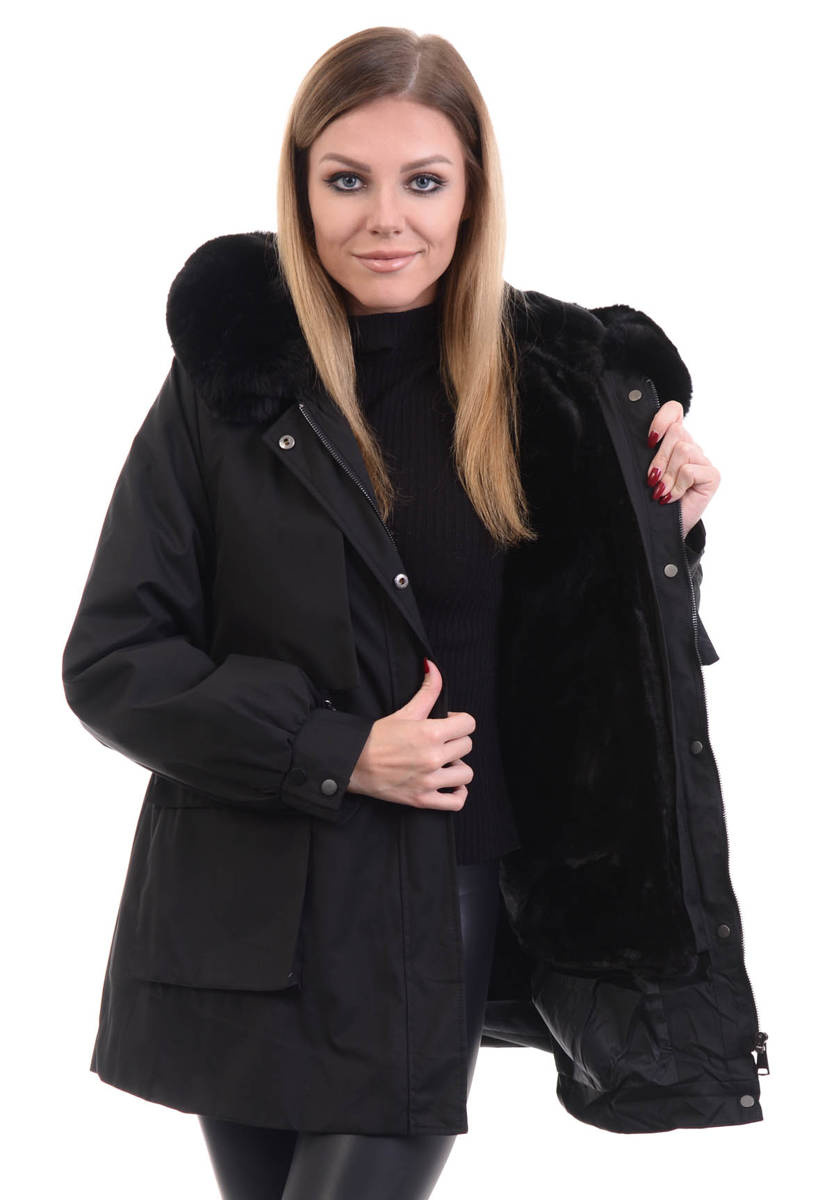Jedna z modniejszych w tym sezonie kurtka parka 2 w 1 w kolorze czarnym. Kurtka zapinana jest na suwak i napy. Dodatkowego wdzięku daje kurtce nieodpinany kaptur z pięknym futerkiem, który idealnie sprawdzi się w chłodniejsze dni oraz jako ochrona przed wiatrem. Dwie niezapinane na kieszenie dodają kurtce klasy. Mankiety rękawów zapinane na napy.