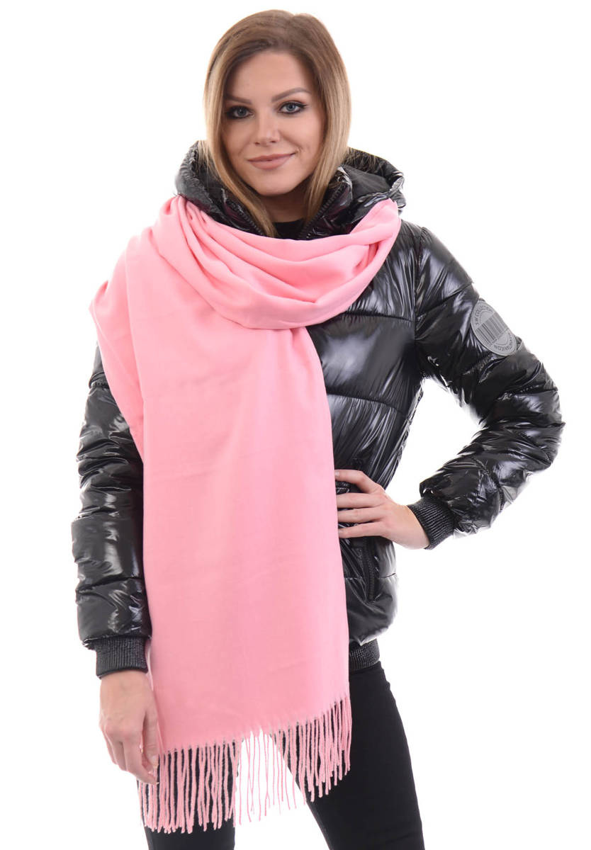 Damski duży szalik. Szalik w kolorze jasno różowym. Szal sprawdzi się idealnie do wielu stylizacji na jesienne oraz zimowe dni. Materiał: 100% Wiskoza. Wymiary ok. 186 cm x 67 cm.