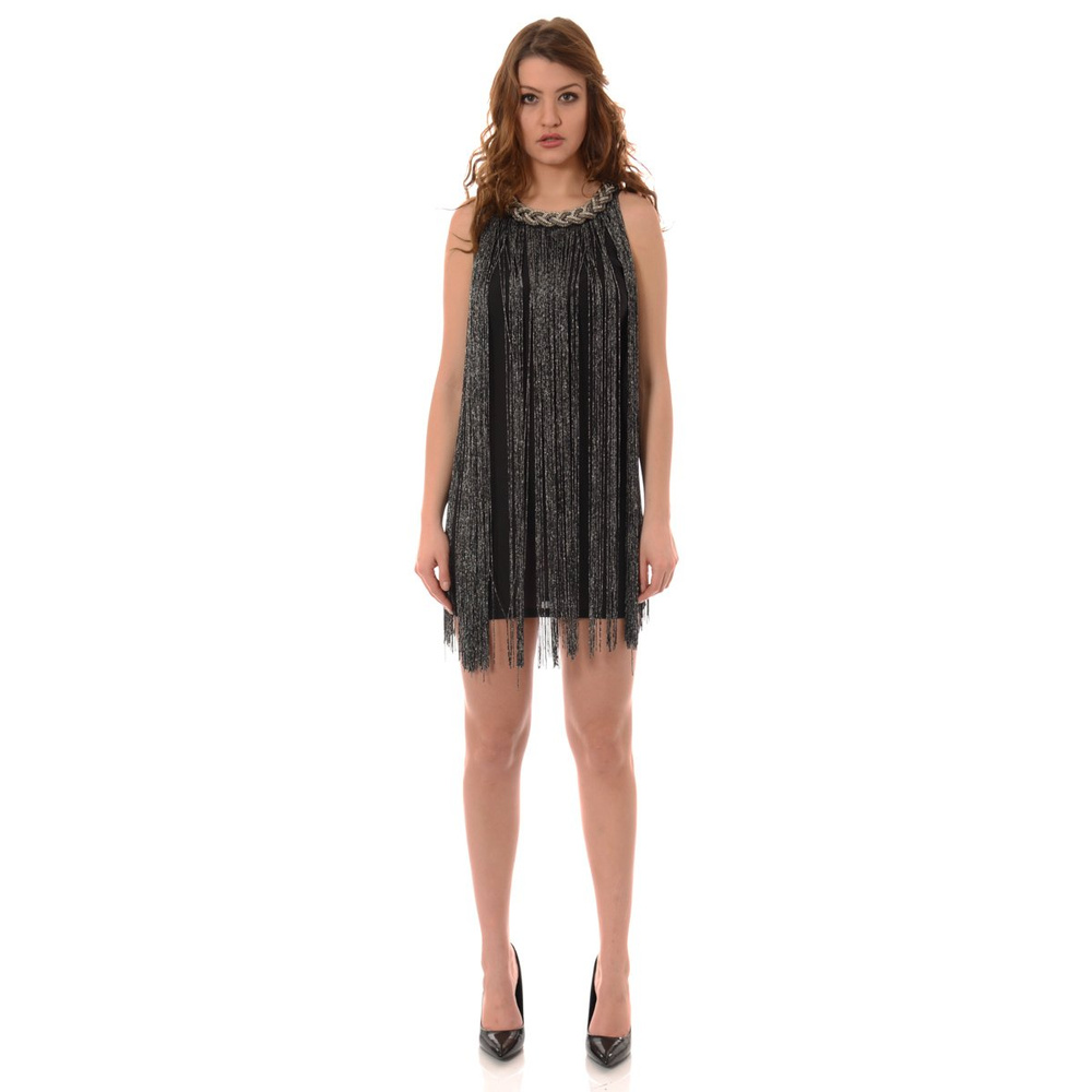 Piękna damska sukienka z najmodniejszymi w tym sezonie frędzlami w kolorze czarno-srebrnym.