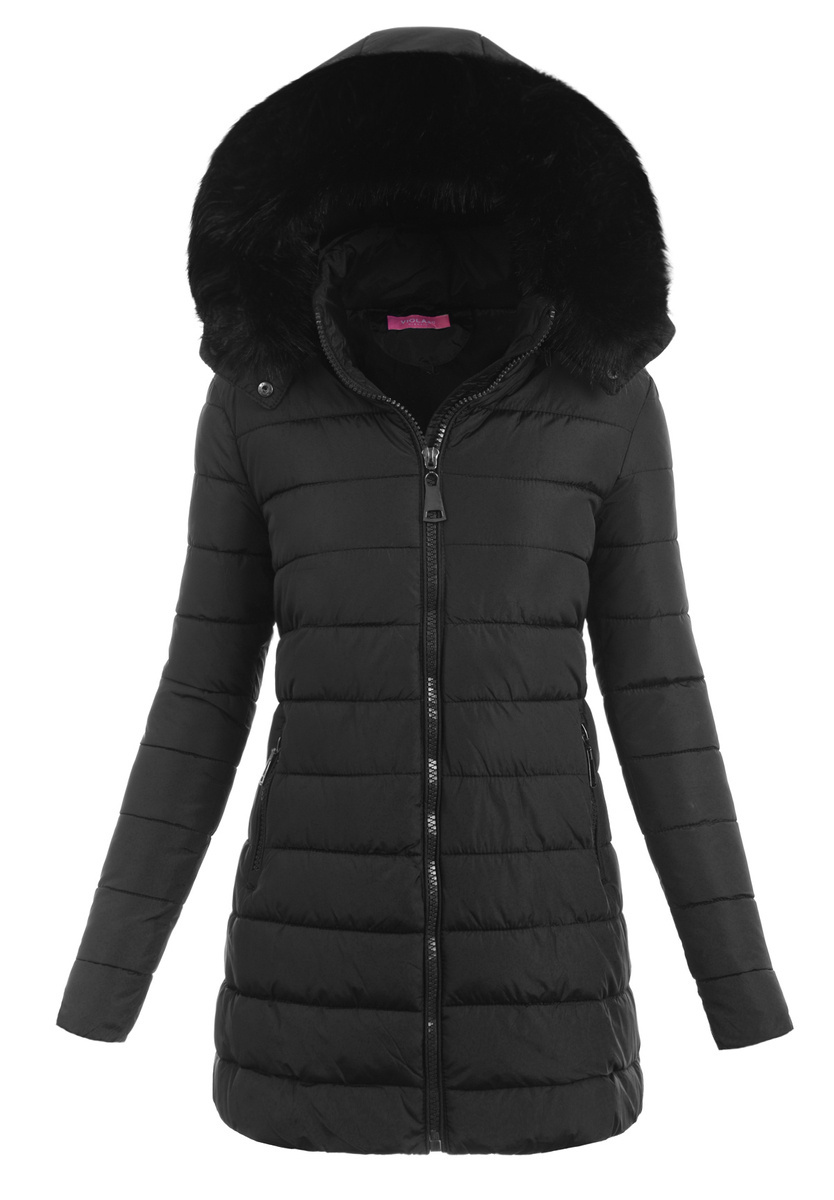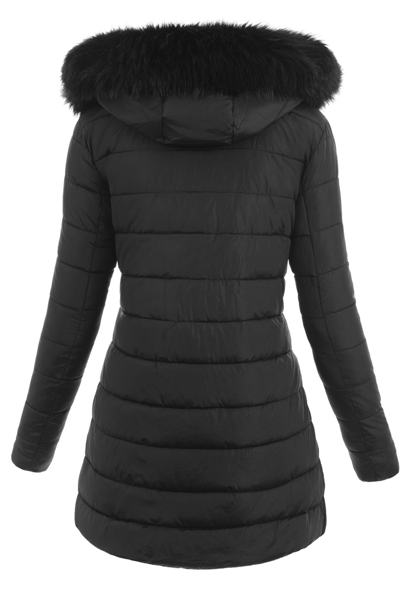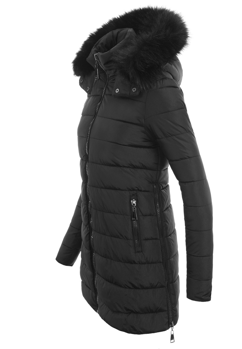 Przepiękna kurtka zimowa damska w kolorze czarnym. Kurtka zapinana jest na suwak i posiada z przodu dwie kieszenie zasuwane na suwaki. Ozdobne suwaki po bokach kurtki. Wysokiej jakości wypełnienie syntetyczne zapewnia ochronę w mroźne, zimowe dni. Rękawy kurtki są ocieplane, wykończone podszewką. Kaptur kurtki jest odpinany oraz wykończony przemiłym w dotyku futerkiem. Dzięki ściągaczom w rękawach oraz pasie kurtka idealnie dopasowuje się do sylwetki. Kurtka wykonana jest z materiałów najwyższej jakości. Kurtka idealnie sprawdzi się w różnego rodzaju zimowych stylizacjach.