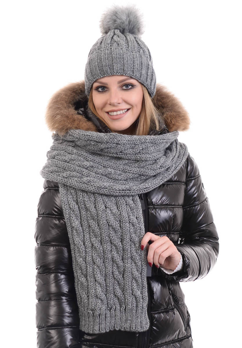 Damski komplet w kolorze szarym. Czapka ze splotem z warkocza, posiada wywijany ściągacz. Czapka z pomponem zapewnia ciepło w mroźne dni. Długi szalik ozdobiony splotem z warkocza. Komplet sprawdzi się idealnie do wielu stylizacji na jesienne oraz zimowe dni.