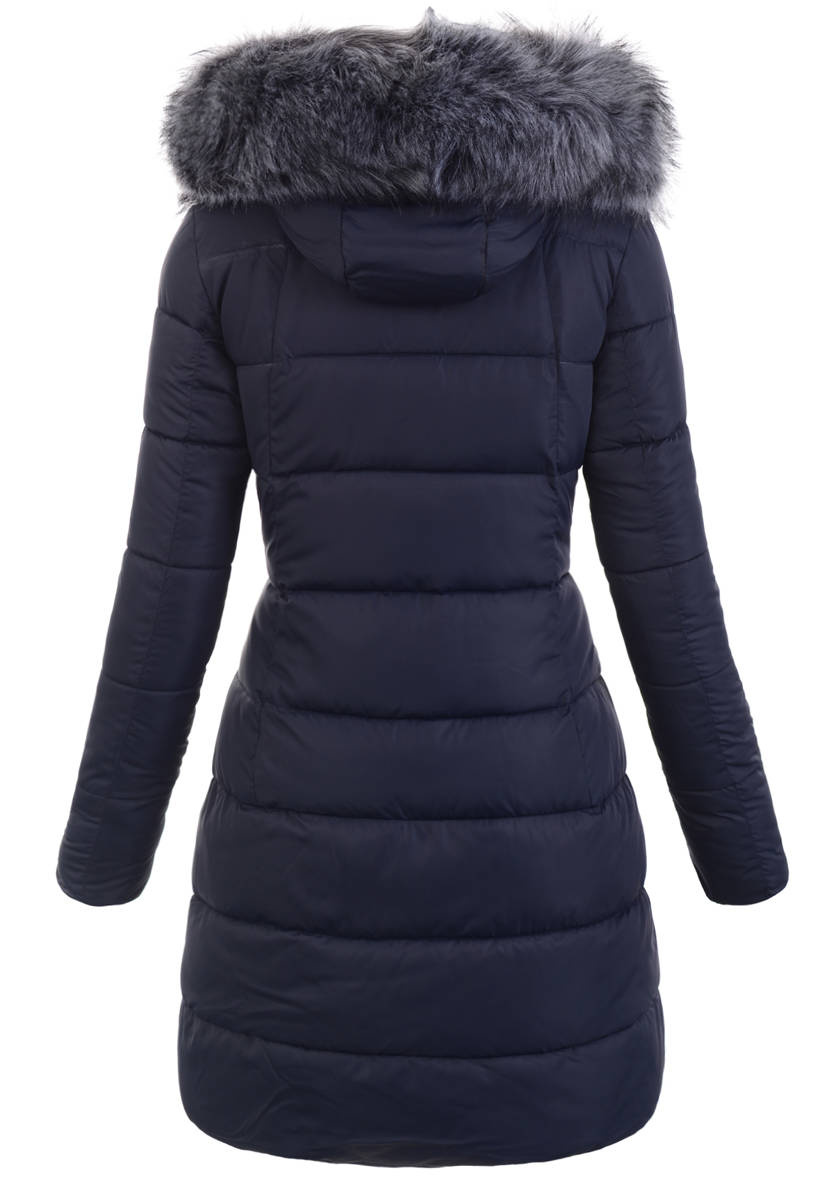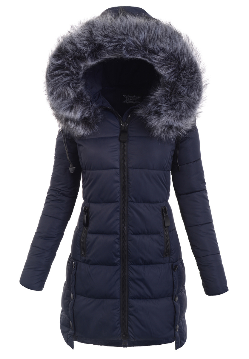 Rewelacyjna kurtka damska w kolorze granatowym. Ciepłe wypełnienie kurtki zapewnia ciepło w mroźne dni.  Rękawy kurtki są ocieplone, wykończone podszewką. Kurtka zasuwana jest na podwójny suwak. Kurtka posiada z przodu na dole dwie kieszenie zasuwane na suwak. Nieodpinany kaptur ze ściągaczem i  z odpinanym futerkiem zapewnia ciepło w wietrzne zimowe dni. Fantazyjny dół kurtki dodaje kurtce uroku. Kurtka wykonana jest z materiałów najwyższej jakości. Kurtka posiada ściągacz w mankietach. Tył kurtki dłuży o 7 cm. Rozpinane ozdobne napy na dole po bokach. Kurtka ocieplona jest bardzo wysokiej jakości wypełnieniem syntetycznym, które zapewnia doskonałą termoizolację oraz wysoki komfort użytkowania.