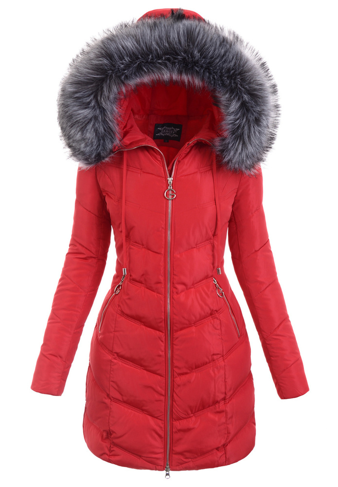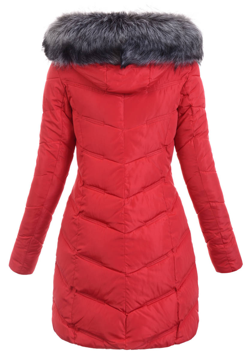 Rewelacyjna kurtka damska w kolorze czerwonym. Wypełnienie kurtki zapewnia ciepło w mroźne dni. Kurtka w środku wykończona jest podszewką. Rękawy kurtki są ocieplane, wykończone podszewką. Kurtka zasuwana jest na podwójny suwak. Kurtka posiada z przodu dwie kieszenie zasuwane na suwaki.  Nieodpinany kaptur i wysoka stójka zapewniają ciepło w wietrzne zimowe dni. Futerko przy kapturze jest odpinane. Kurtka wykonana jest z materiałów najwyższej jakości. Kurtka w mankietach posiada ściągacz. Suwaki kurtki w srebrnym kolorze. Kurtka ocieplona jest bardzo wysokiej jakości wypełnieniem syntetycznym, które zapewnia doskonałą termoizolację oraz wysoki komfort użytkowania.