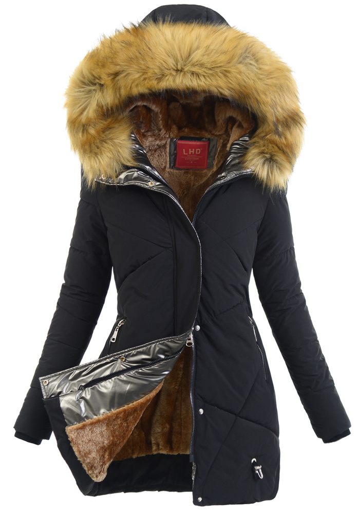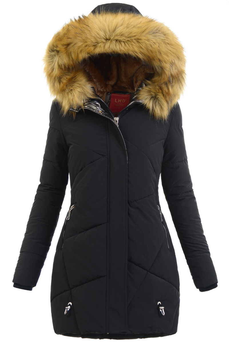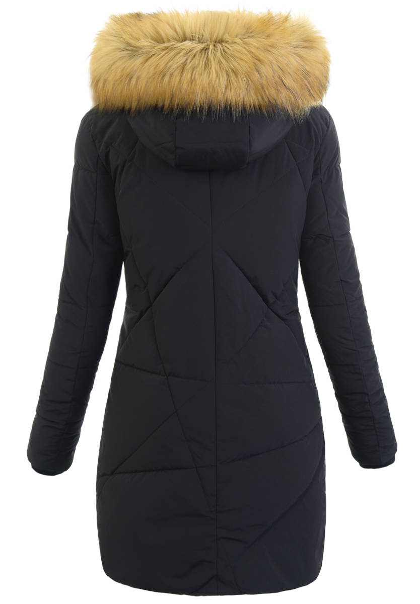 Cudowna kurtka zimowa damska w kolorze czarnym. Kurtka zapinana jest na suwak, który jest przykryty listwą zapinaną na napy. Kurtka posiada z przodu dwie kieszenie zasuwane na suwaki. Wysokiej jakości wypełnienie syntetyczne jest równomiernie rozłożone na całej długości kurtki i zapewnia ochronę w mroźne, zimowe dni. Rękawy kurtki są ocieplane, wykończone podszewką. Kaptur kurtki jest nieodpinany oraz wykończony przemiłym w dotyku futerkiem. Futerko przy kapturze jest odpinane. Kurtka w środku wykończona jest futerkiem. Dzięki ściągaczom w rękawach kurtka idealnie dopasowuje się do sylwetki. Kurtka wykonana jest z materiałów najwyższej jakości. Kurtka idealnie sprawdzi się w różnego rodzaju zimowych stylizacjach.