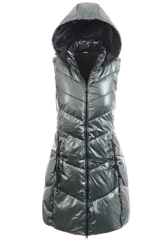 Przecudna, długa kamizelka w kolorze zielonym. Jest ona zasuwana na podwójny suwak. Modny krój kamizelki sprawia, że bezrękawnik idealnie sprawdza się w wielu wiosennych oraz jesiennych stylizacjach. Kamizelka posiada dwie kieszenie zapinane na napy. Delikatne ocieplenie oraz kaptur ze ściągaczem zapewnia ciepło w chłodniejsze dni oraz ochronę przed wiatrem i deszczem. Kaptur w kamizelce jest odpinany.