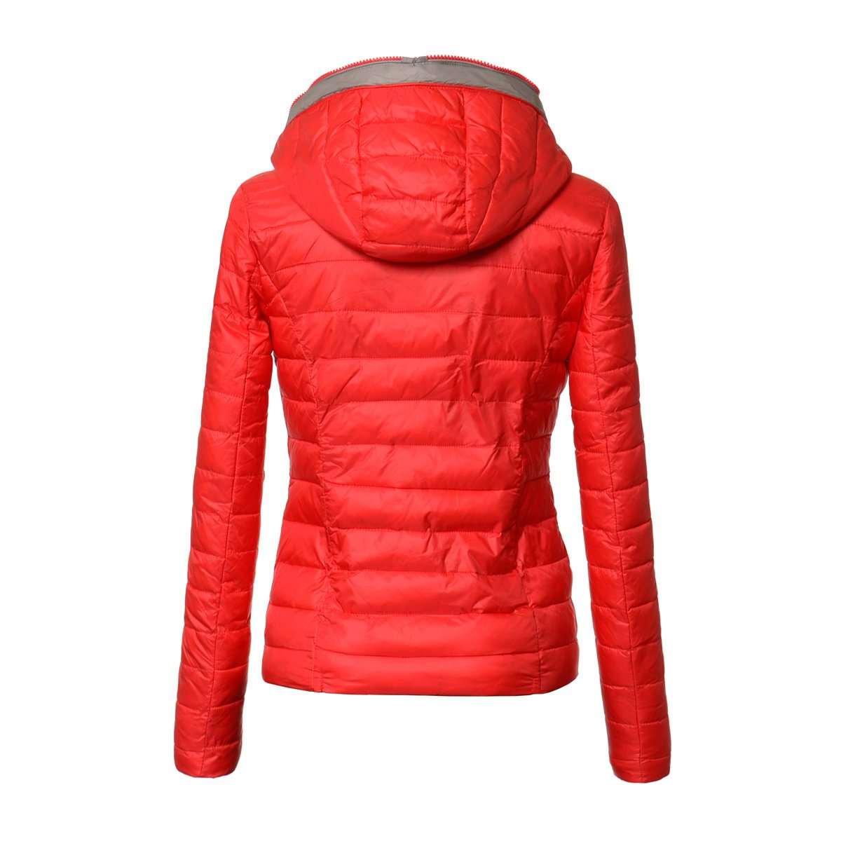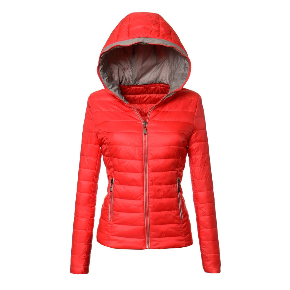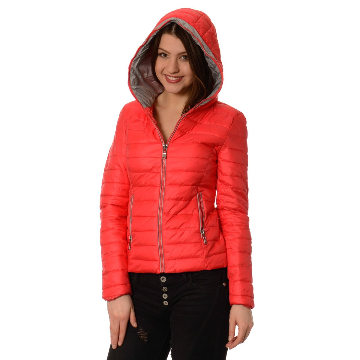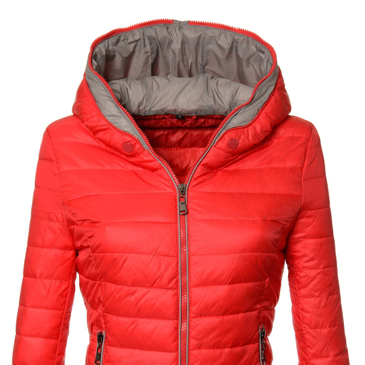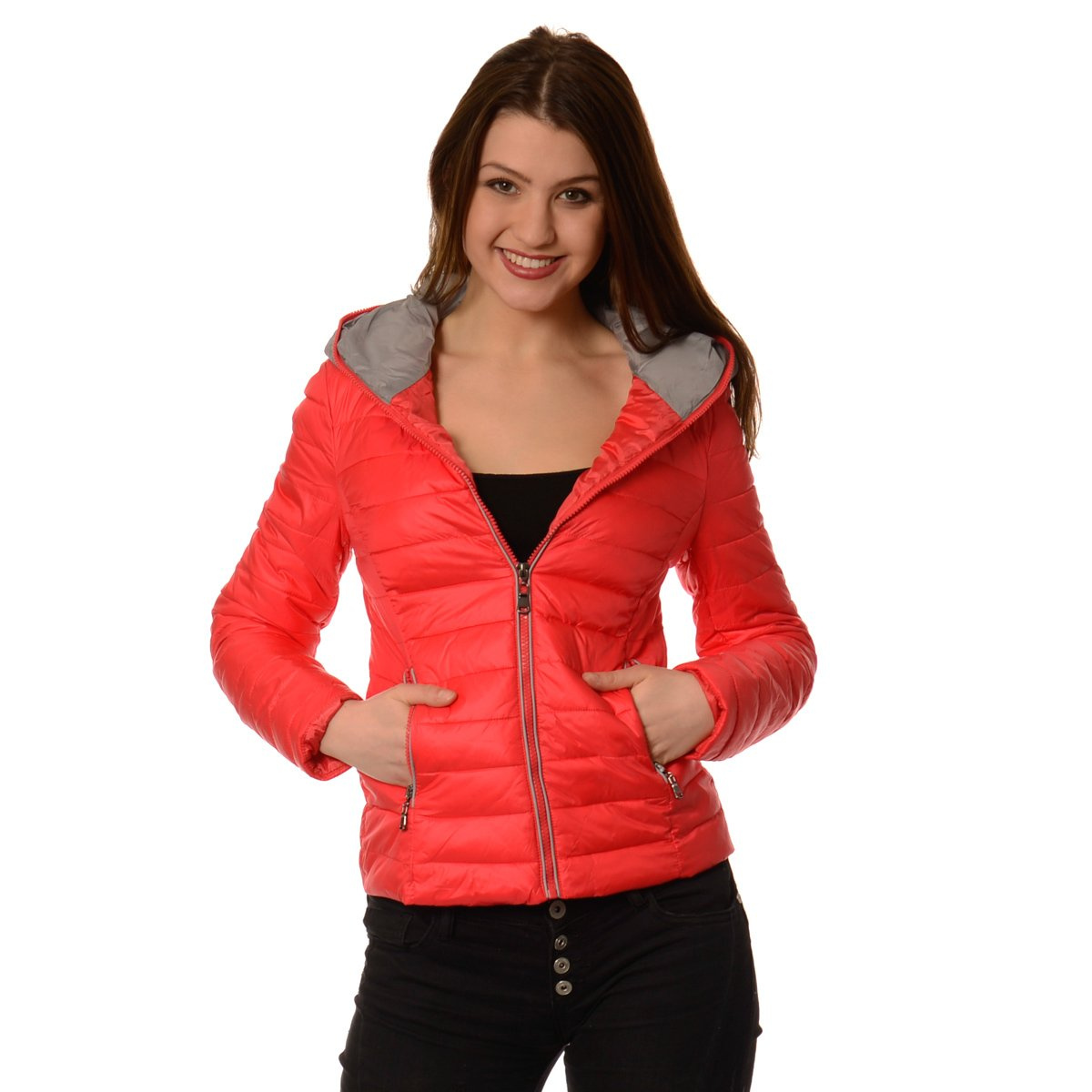 Kurtka damska zapinana na suwak, który ciągnie się przez całą długość kurtki oraz kaptur.