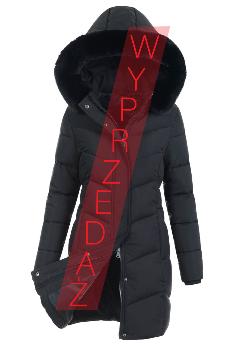 Damska zimowa, pikowana kurtka, w kolorze czarnym. Płaszcz jest bezwzględnym hitem tego sezonu. Model ten posiada bardzo praktyczny podwójny suwak w kolorze kurtki oraz dwie pojemne kieszenie również zapinane na suwak. Dodatkowym atutem jest duży odpinany kaptur z odpinanym pięknym puszystym futrem w kolorze czarnym. Kurtka ocieplona jest wysokiej jakości wypełnieniem syntetycznym i wykończona w środku podszewką. Kurtka jest idealnym rozwiązaniem dla Pań ceniących sobie ciepło oraz elegancję, jest dopełnieniem modnych zimowych stylizacji.