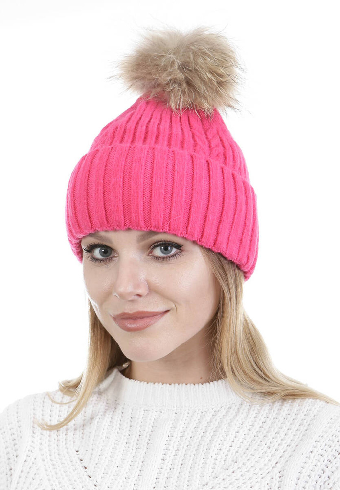 Przepiękna damska czapka w kolorze różowym. Czapka z grubym splotem, wywijana. Czapka posiada pompon z naturalnego futerka. Czapka wykonana z miękkiej włóczki idealnie sprawdza się do wielu jesiennych jak i zimowych stylizacji.