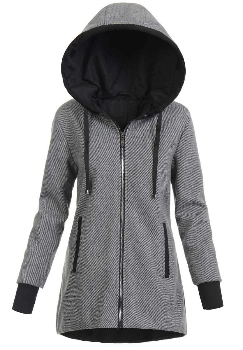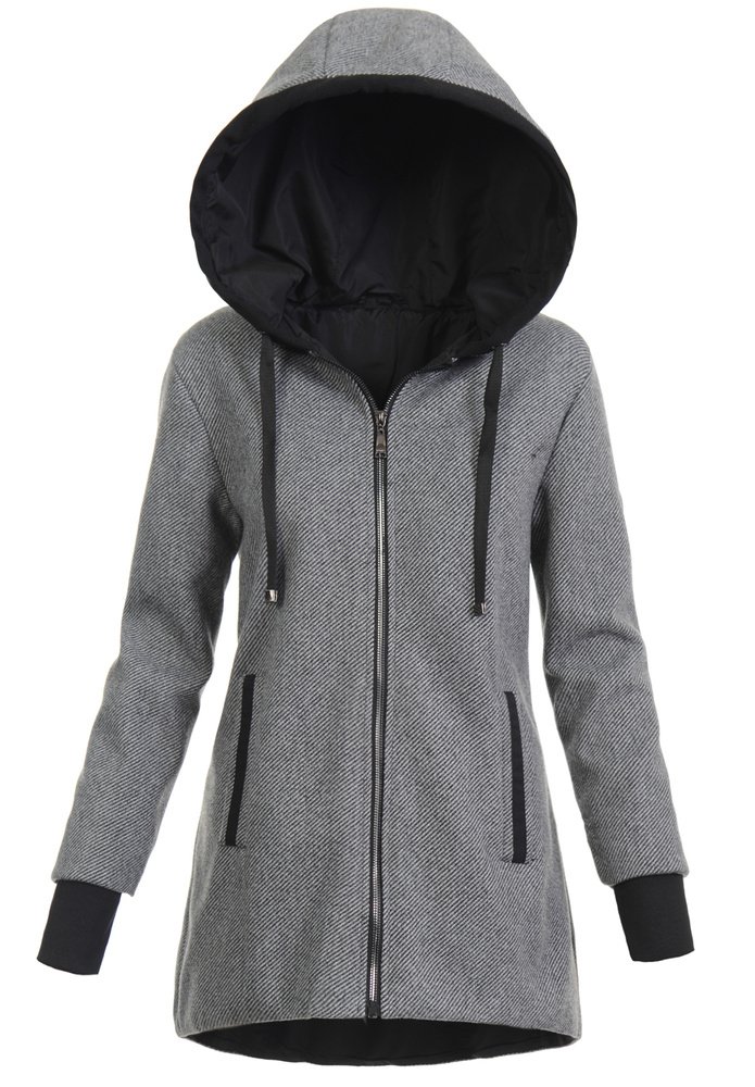 Bardzo modny i elegancki płaszcz w kolorze czarnym. Jesionka zapinana jest na suwak. Płaszcz wykończony jest cienką, poliestrową podszewką. Posiada dwie pojemne kieszenie. Kurtka posiada nieodpinany kaptur ze ściągaczem. Dodatkowo w rękawach znajdują się materiałowe ściągacze o długości 8 cm. Jesionka jest idealnym rozwiązaniem dla osób ceniących sobie wygodę oraz elegancję idealna do wielu stylizacji. Tył dłuższy o ok 6 cm.