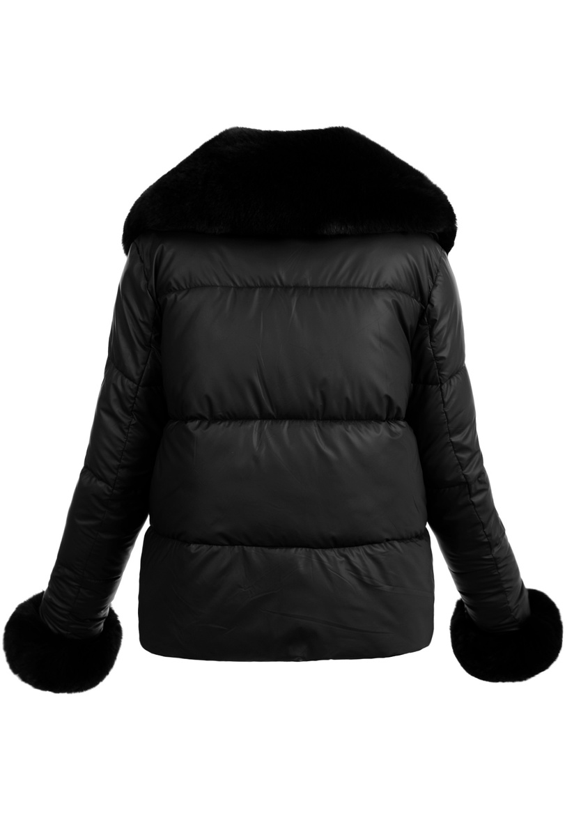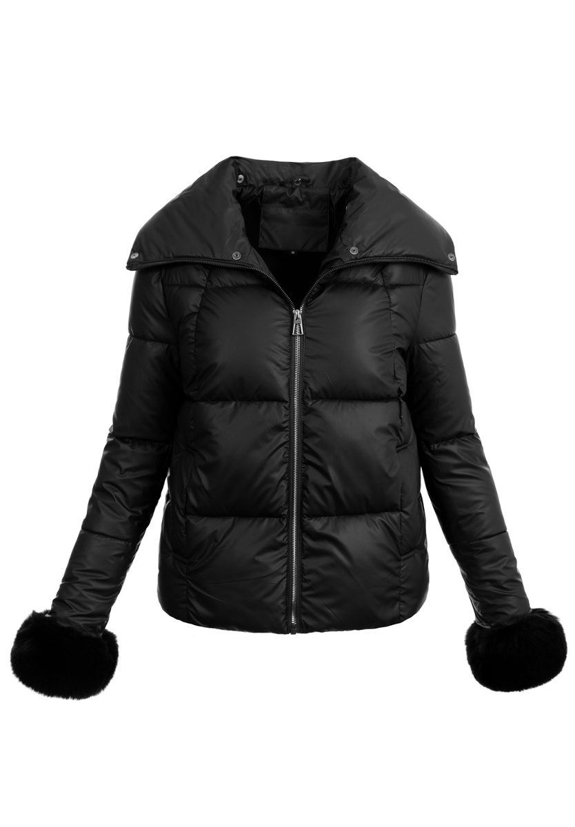 Przepiękna, bardzo modna w tym sezonie, krótka damska zimowa, pikowana kurtka w kolorze czarnym. Kurtka jest zapinana na suwak . Ocieplona wysokiej jakości wypełnieniem syntetycznym, która zapewnia termoizolację i wysoki komfort użytkowania. Posiada dwie pojemne kieszenie. Dodatkowo kurtka posiada duży kołnierz z odpinanym futerkiem. Kurtka posiada ściągacz na dole. Rękawy kurtki obszyte futerkiem. Kurteczka jest idealnym rozwiązaniem dla osób ceniących sobie wygodę idealna do wielu stylizacji.
