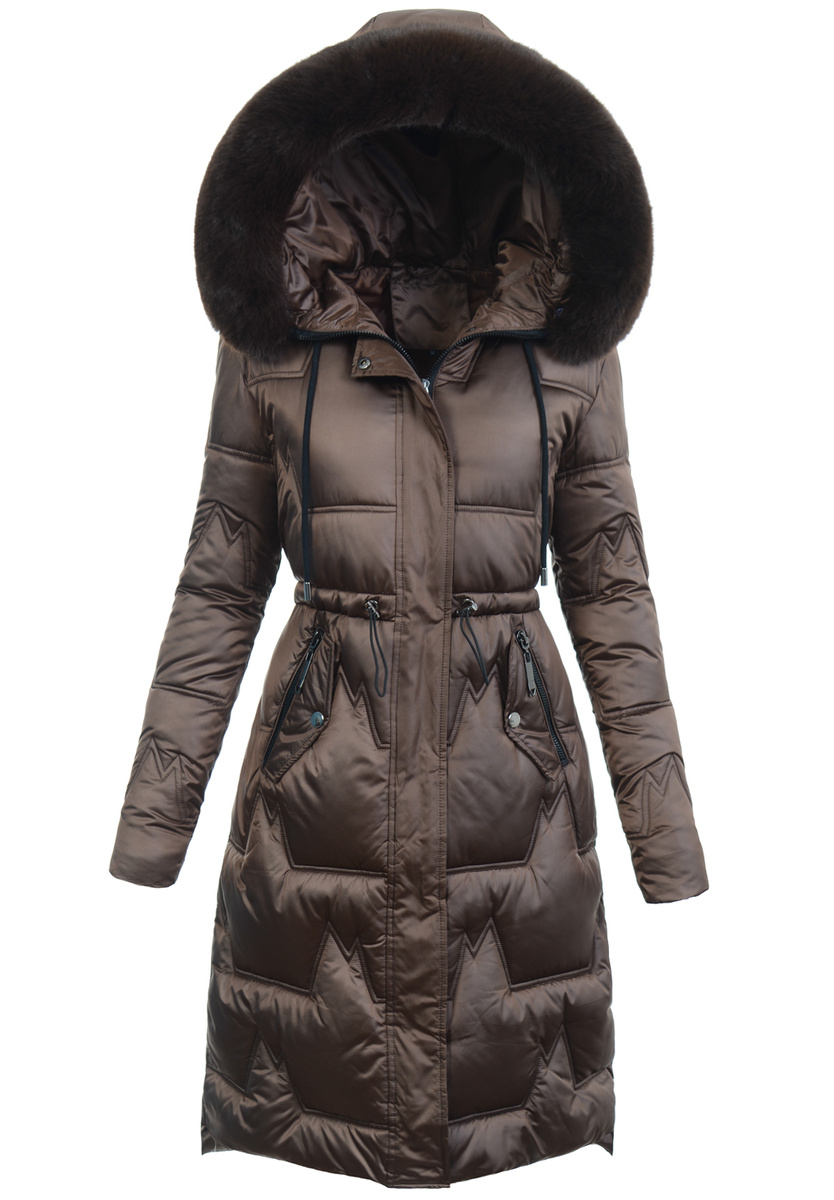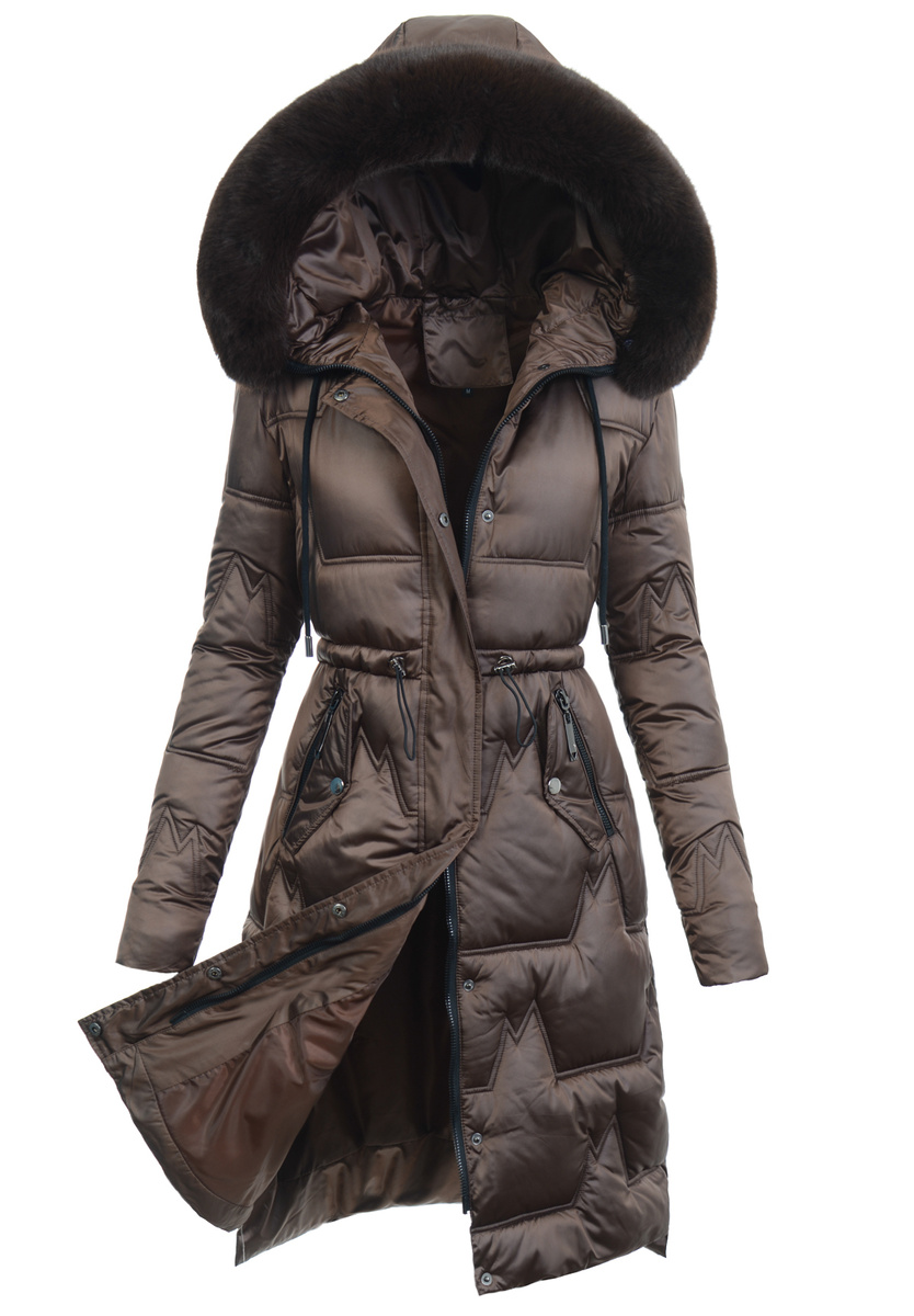 Przepiękna, damska zimowa, pikowana kurtka w kolorze brązowym. Kurtka jest zapinana na podwójny suwak oraz napy. Ocieplona wysokiej jakości wypełnieniem syntetycznym, która zapewnia termoizolację i wysoki komfort użytkowania. Posiada dwie pojemne kieszenie zapinane na suwak. Dodatkowo kurtka posiada duży kaptur ze ściągaczem i odpinanym futerkiem. Kaptur jest nieodpinany. Kurtka posiada ściągacz w talii. Kurteczka jest idealnym rozwiązaniem dla osób ceniących sobie wygodę idealna do wielu stylizacji.