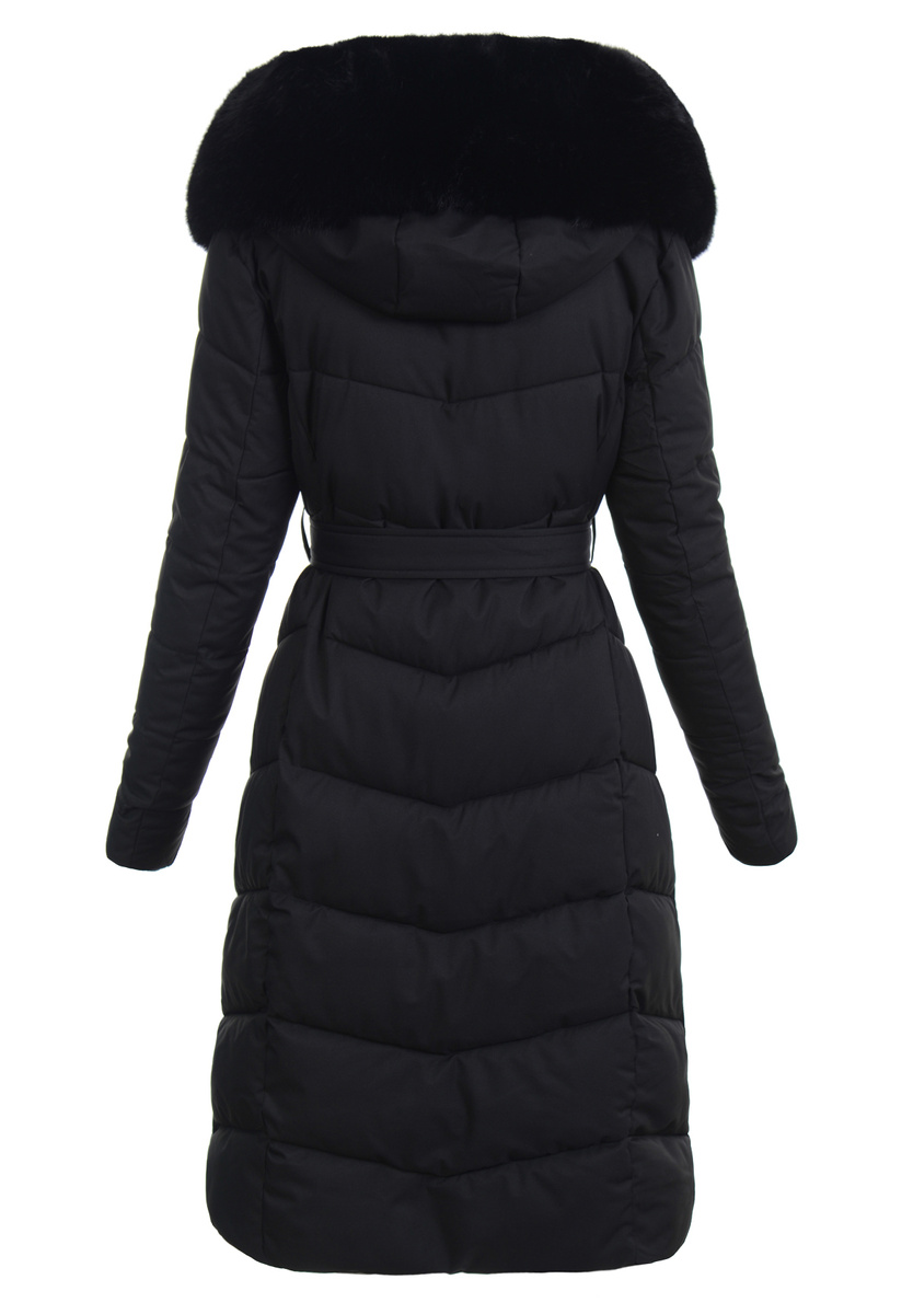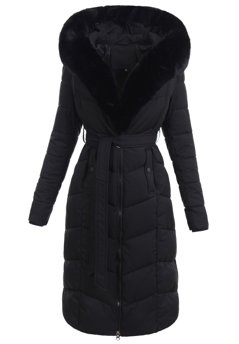 Elegancka, bardzo ciepła, damska zimowa Kurtka. Kurtka jest w kolorze czarnym, zapinana na podwójny suwak. Ocieplona wysokiej jakości wypełnieniem syntetycznym, która zapewnia termoizolację i wysoki komfort użytkowania. Posiada dwie pojemne kieszenie. Dodatkowo kurtka posiada duży kaptur, który idealnie nadaje się do ochrony podczas wietrznej i deszczowej pogody. Kaptur jest nieodpinany. Wzdłuż kaptura oraz suwaka znajduje się odpinane futerko. Kurtka posiada pasek do zawiązania w talii. Kurteczka jest idealnym rozwiązaniem dla osób ceniących sobie wygodę idealna do wielu stylizacji.