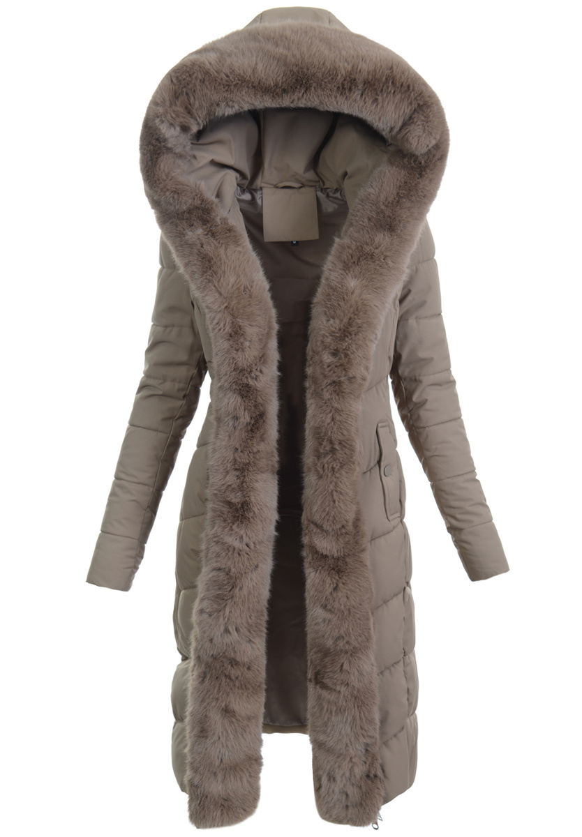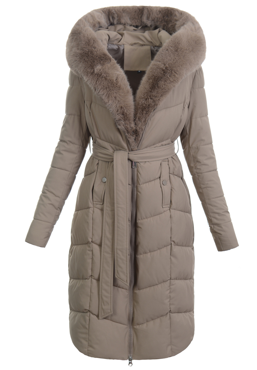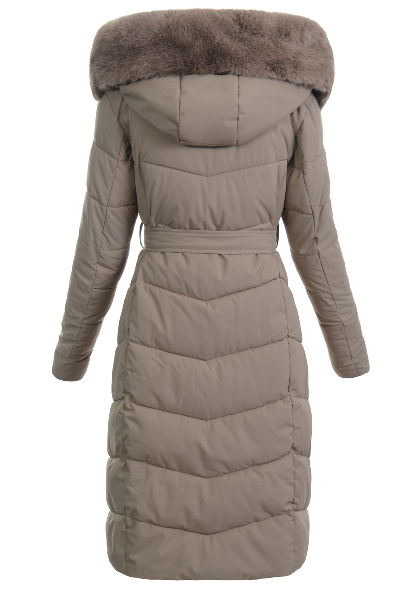 Elegancka, bardzo ciepła, damska zimowa Kurtka. Kurtka jest w kolorze brązowym, zapinana na podwójny suwak. Ocieplona wysokiej jakości wypełnieniem syntetycznym, która zapewnia termoizolację i wysoki komfort użytkowania. Posiada dwie pojemne kieszenie. Dodatkowo kurtka posiada duży kaptur, który idealnie nadaje się do ochrony podczas wietrznej i deszczowej pogody. Kaptur jest nieodpinany. Wzdłuż kaptura oraz suwaka znajduje się odpinane futerko. Kurtka posiada pasek do zawiązania w talii. Kurteczka jest idealnym rozwiązaniem dla osób ceniących sobie wygodę idealna do wielu stylizacji.