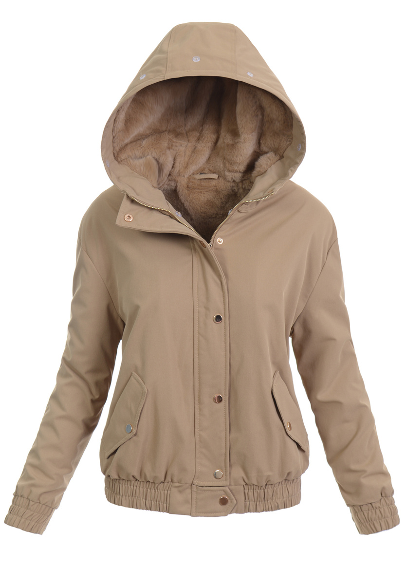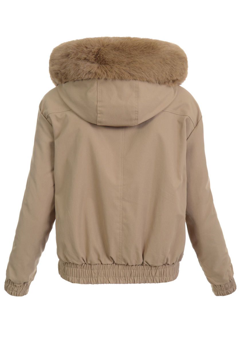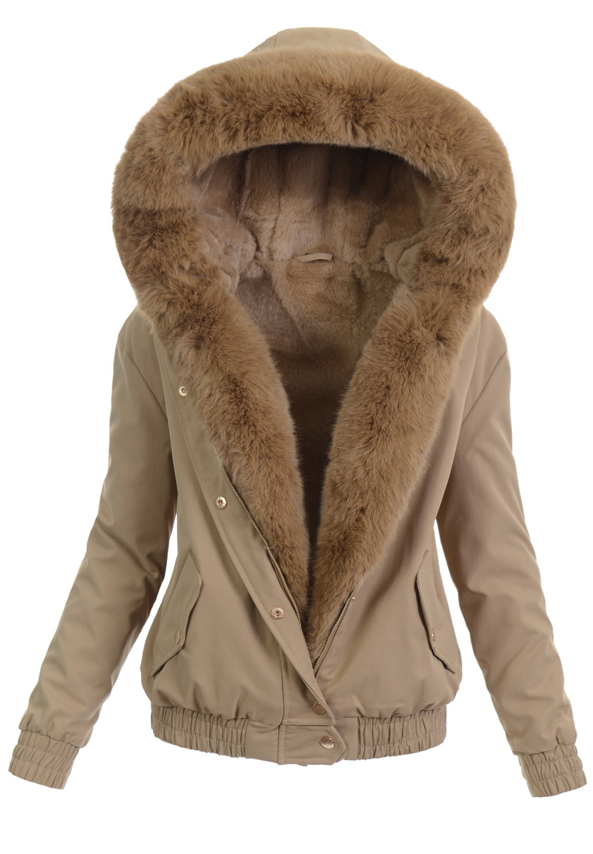 Elegancka, bardzo ciepła, damska zimowa kurtka parka. Kurtka jest w kolorze jasno brązowym, zapinana na suwak oraz napy. Ocieplona wysokiej jakości futerkiem, która zapewnia termoizolację i wysoki komfort użytkowania. Posiada dwie pojemne kieszenie. Dodatkowo kurtka posiada duży kaptur, który idealnie nadaje się do ochrony podczas wietrznej i deszczowej pogody. Kaptur jest nieodpinany. Wzdłuż kaptura oraz suwaka znajduje się odpinane futerko. Na dole kurtki oraz w rękawach znajdują się ściągacze. Kurteczka jest idealnym rozwiązaniem dla osób ceniących sobie wygodę idealna do wielu stylizacji.