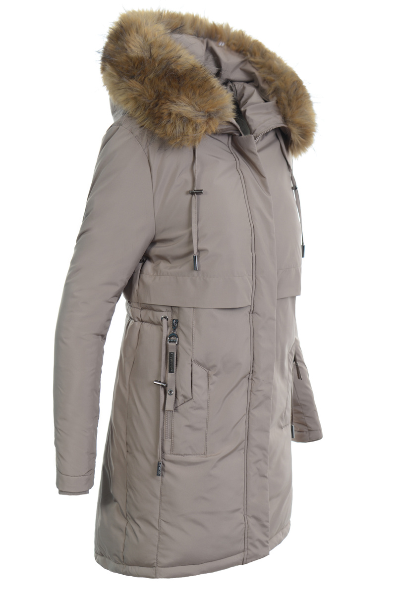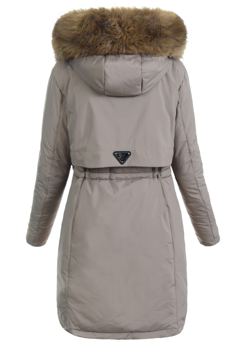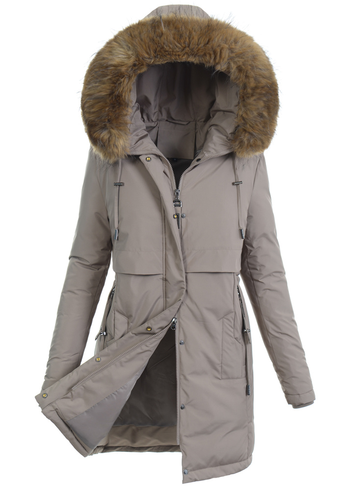 Popularna w tym sezonie, bardzo ciepła, damska zimowa kurtka ortalionowa. Kurtka jest w kolorze brązowym, zapinana na suwak i napy. Ocieplona wysokiej jakości ociepleniem syntetycznym, który zapewnia termoizolację i wysoki komfort użytkowania. Posiada dwie pojemne kieszenie, które są zapinane na suwak. Dodatkowo kurtka posiada duży kaptur ze ściągaczem, który idealnie nadaje się do ochrony podczas wietrznej i deszczowej pogody. Kaptur jest nieodpinany i posiada odpinane futerko. Dodatkowym atutem jest ściągacz w talii, który pozwala na dopasowanie kurtki do sylwetki. Kurteczka jest idealnym rozwiązaniem dla osób ceniących sobie wygodę idealna do wielu stylizacji. Tył dłuższy o ok 7 cm.