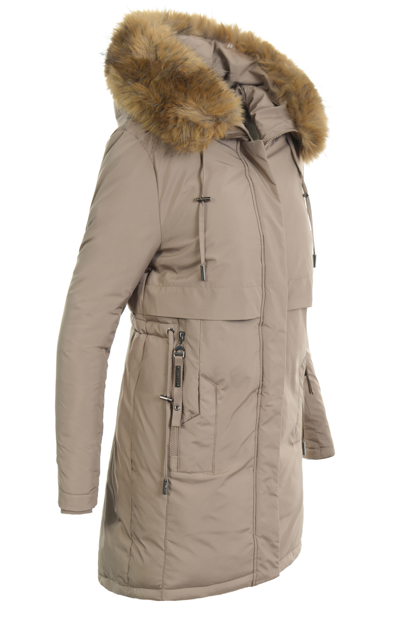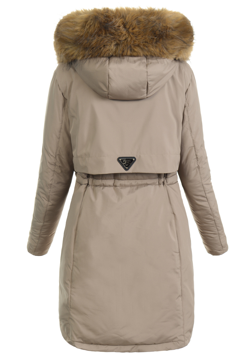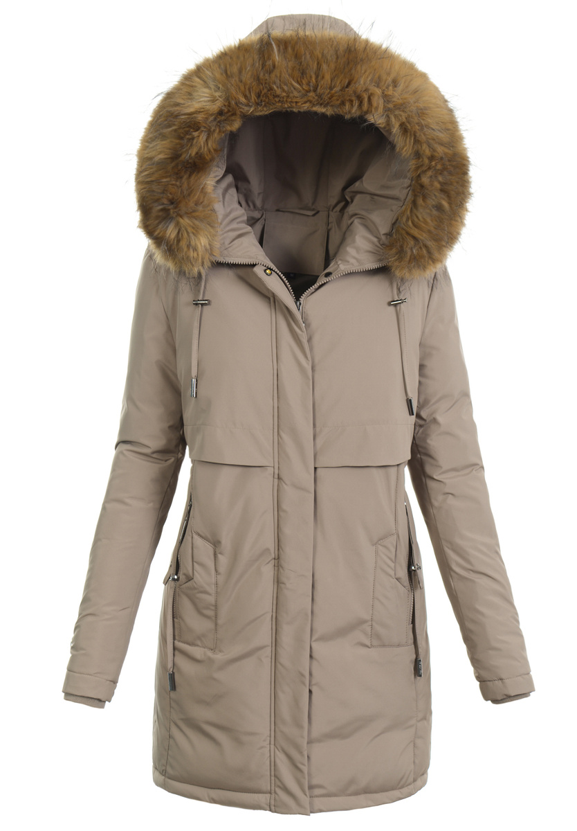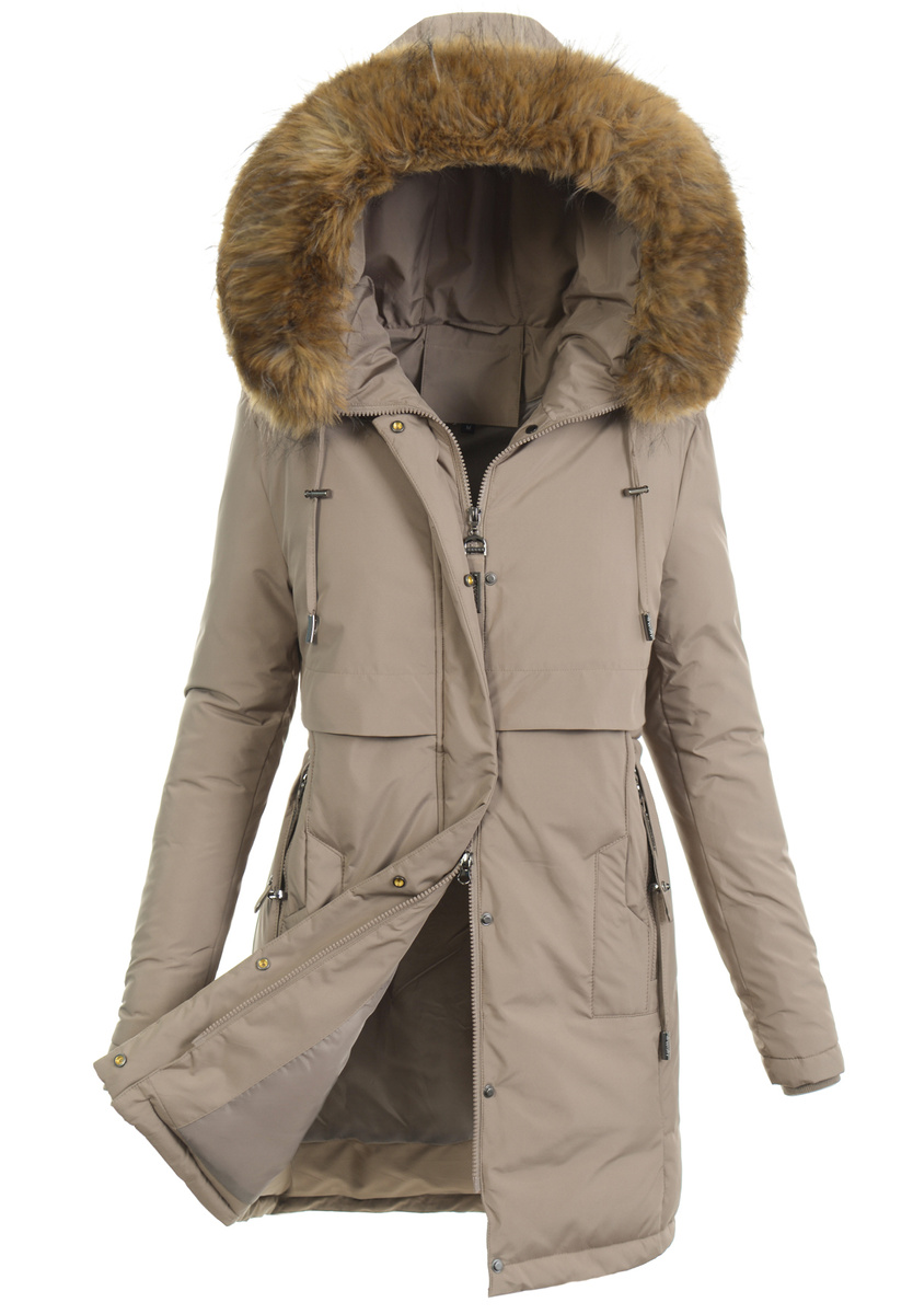 Popularna w tym sezonie, bardzo ciepła, damska zimowa kurtka ortalionowa. Kurtka jest w kolorze beżowym, zapinana na suwak i napy. Ocieplona wysokiej jakości ociepleniem syntetycznym, który zapewnia termoizolację i wysoki komfort użytkowania. Posiada dwie pojemne kieszenie, które są zapinane na suwak. Dodatkowo kurtka posiada duży kaptur ze ściągaczem, który idealnie nadaje się do ochrony podczas wietrznej i deszczowej pogody. Kaptur jest nieodpinany i posiada odpinane futerko. Dodatkowym atutem jest ściągacz w talii, który pozwala na dopasowanie kurtki do sylwetki. Kurteczka jest idealnym rozwiązaniem dla osób ceniących sobie wygodę idealna do wielu stylizacji. Tył dłuższy o ok 7 cm.