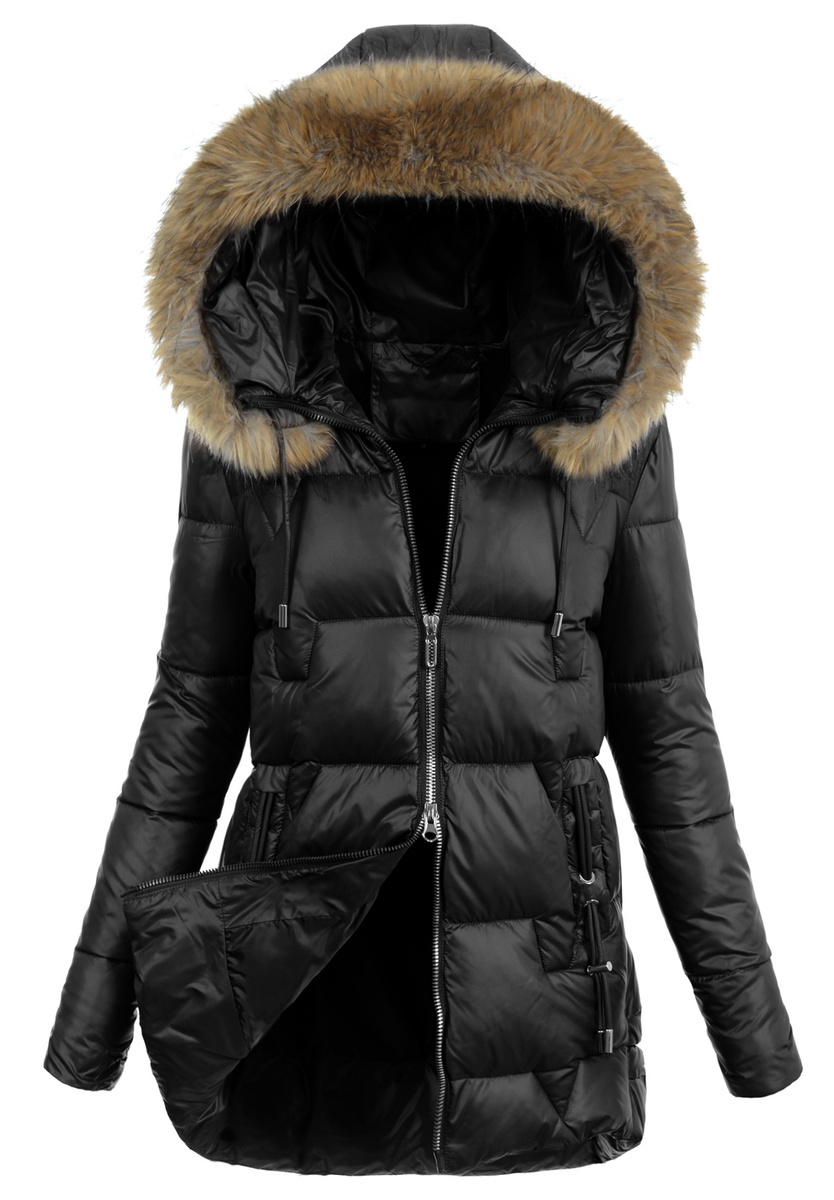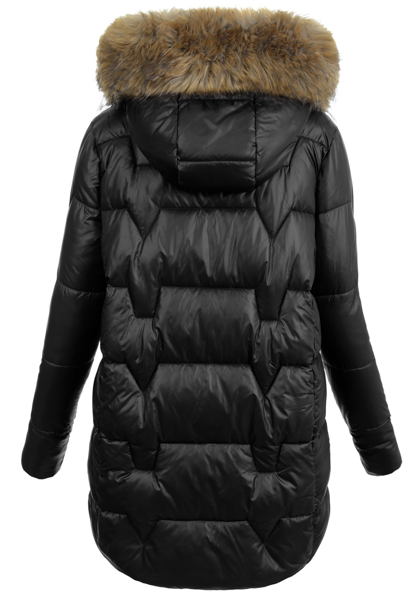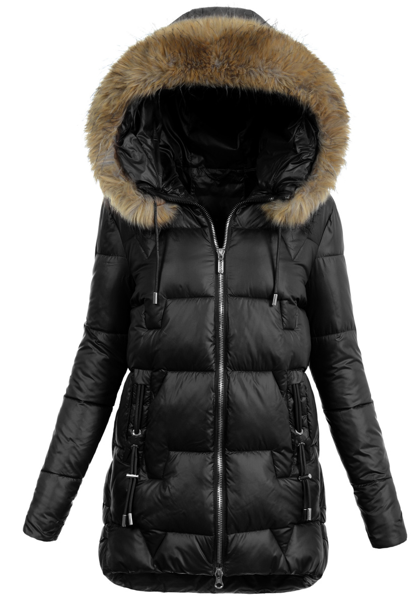 Bardzo modna w tym sezonie kurtka zimowa damska w kolorze czarnym. Kurtka zapinana jest na podwójny suwak i posiada z przodu dwie kieszenie. Wysokiej jakości wypełnienie syntetyczne jest równomiernie rozprowadzone po kurtce i zapewnia ochronę w mroźne, zimowe dni. Rękawy kurtki są ocieplane, wykończone podszewką.  Dodatkowym atutem jest nieodpinany kaptur ze ściągaczem i z odpinanym futerkiem, który zapewnia ochronę przed wiatrem i deszczem. Kurtka wykonana jest z materiałów najwyższej jakości. Kurtka idealnie sprawdzi się w różnego rodzaju zimowych stylizacjach. Tył dłuższy o ok 10 cm.