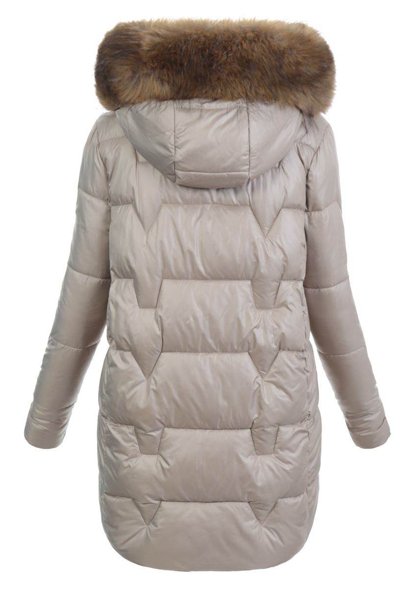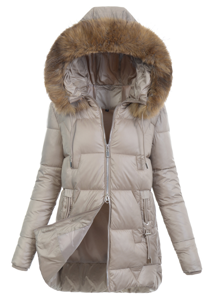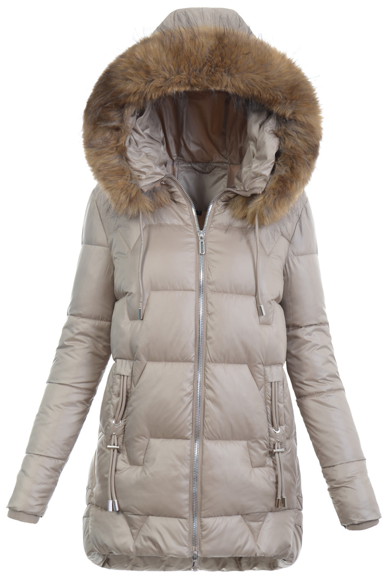 Bardzo modna w tym sezonie kurtka zimowa damska w kolorze beżowym. Kurtka zapinana jest na podwójny suwak i posiada z przodu dwie kieszenie. Wysokiej jakości wypełnienie syntetyczne jest równomiernie rozprowadzone po kurtce i zapewnia ochronę w mroźne, zimowe dni. Rękawy kurtki są ocieplane, wykończone podszewką. Dodatkowym atutem jest nieodpinany kaptur ze ściągaczem i z odpinanym futerkiem, który zapewnia ochronę przed wiatrem i deszczem. Kurtka wykonana jest z materiałów najwyższej jakości. Kurtka idealnie sprawdzi się w różnego rodzaju zimowych stylizacjach. Tył dłuższy o ok 10 cm.