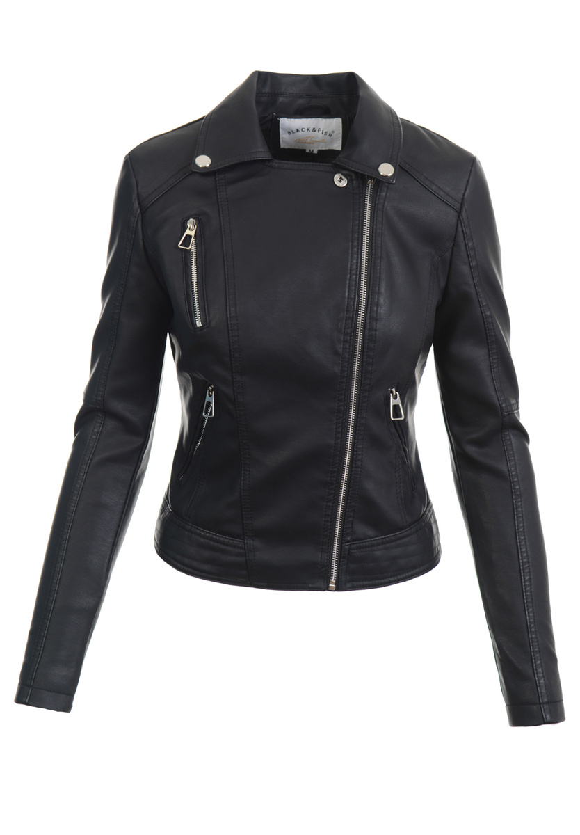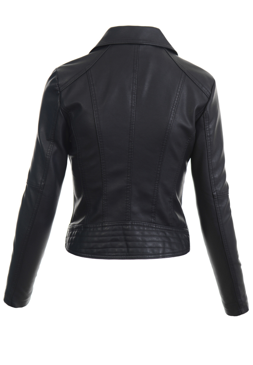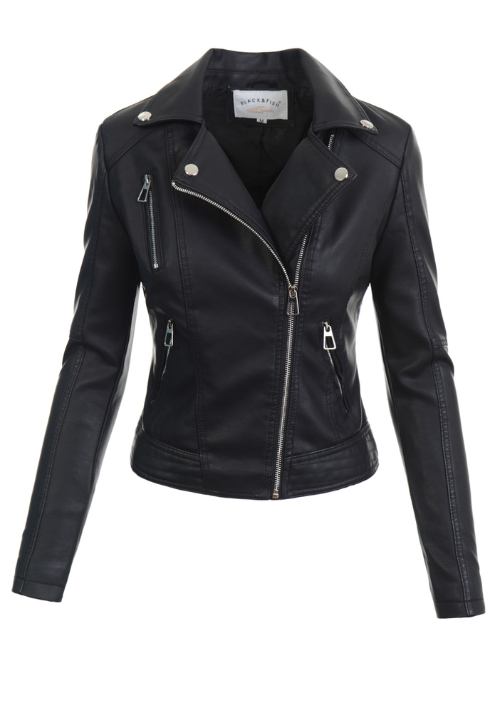 Piękna damska ramoneska. Kolor czarny. Kurtka wykonana z bardzo dobrej jakości ekoskóry. Zapinana jest na ukośny suwak. Po bokach znajdują się dwie kieszenie zapinane na suwak. Na piersi znajduje się jedna atrapa kieszeni zapinana na suwak.  Ramoneska idealnie sprawdza się dla osób ceniących sobie wygodę oraz elegancję. Taliowany krój ramoneski podkreśla talię i kobiece kształty.