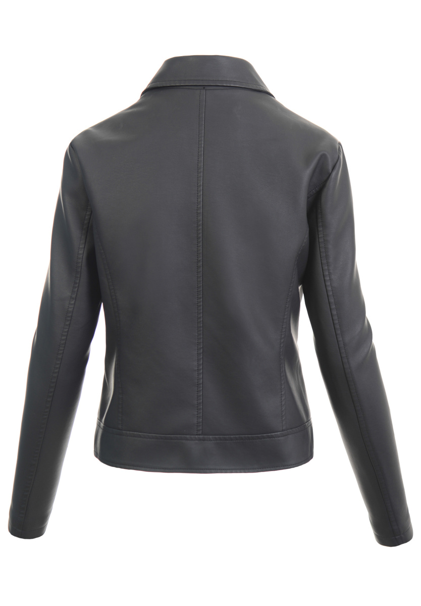 Piękna damska ramoneska. Kolor czarny. Kurtka wykonana z bardzo dobrej jakości ekoskóry. Zapinana jest na ukośny suwak. Po bokach znajdują się dwie kieszenie zapinane na suwak. Dodatkowo na piersi znajduje się atrapa kieszeni zapinana na suwak. Ramoneska idealnie sprawdza się dla osób ceniących sobie wygodę oraz elegancję. Taliowany krój ramoneski podkreśla talię i kobiece kształty.