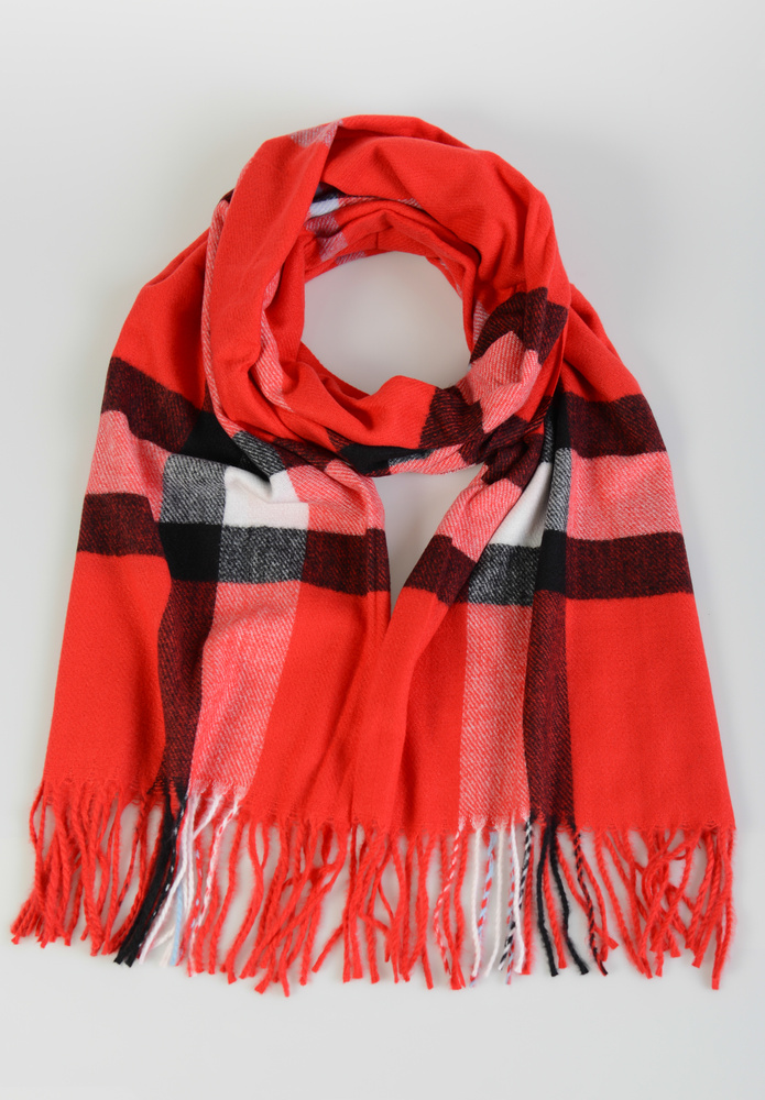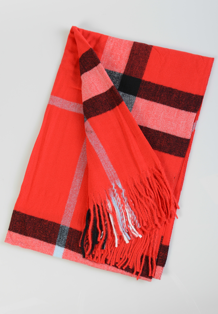 Damski duży szalik. Szal w modną kratę, wielokolorowy w kolorach: czerwonym, białym i czarnym. Szal sprawdzi się idealnie do wielu stylizacji na jesienne oraz zimowe dni. Materiał: 70% Wiskoza, 30% Wełna. Wymiary ok.  186 cm x 67 cm.