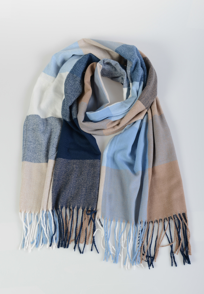 Damski duży szalik. Szal w modną kratę, wielokolorowy w kolorach: brązowym i niebieskim. Szal sprawdzi się idealnie do wielu stylizacji na jesienne oraz zimowe dni. Materiał: 70% Wiskoza, 30% Wełna. Wymiary ok.  186 cm x 67 cm.