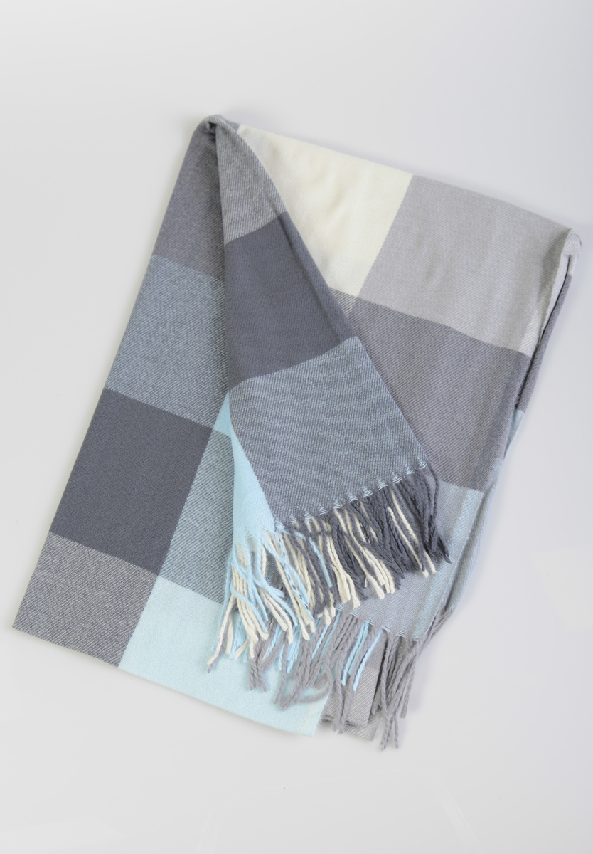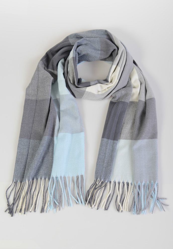 Damski duży szalik. Szal w modną kratę, wielokolorowy w kolorach: szarym i niebieskim. Szal sprawdzi się idealnie do wielu stylizacji na jesienne oraz zimowe dni. Materiał: 70% Wiskoza, 30% Wełna. Wymiary ok. 186 cm x 67 cm.