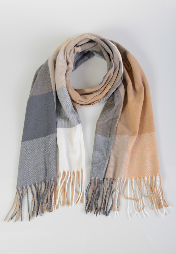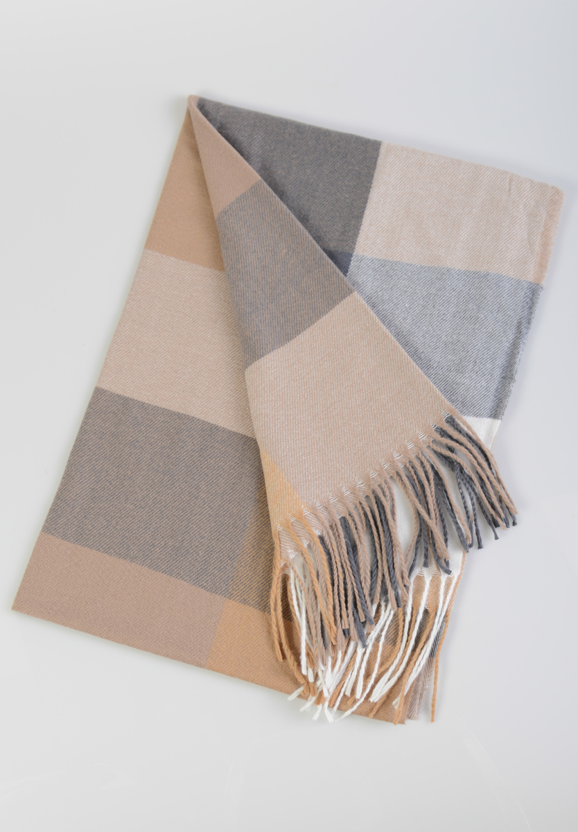 Damski duży szalik. Szal w modną kratę, wielokolorowy w kolorach: szarym, białym i brązowym. Szal sprawdzi się idealnie do wielu stylizacji na jesienne oraz zimowe dni. Materiał: 70% Wiskoza, 30% Wełna. Wymiary ok.  186 cm x 67 cm.