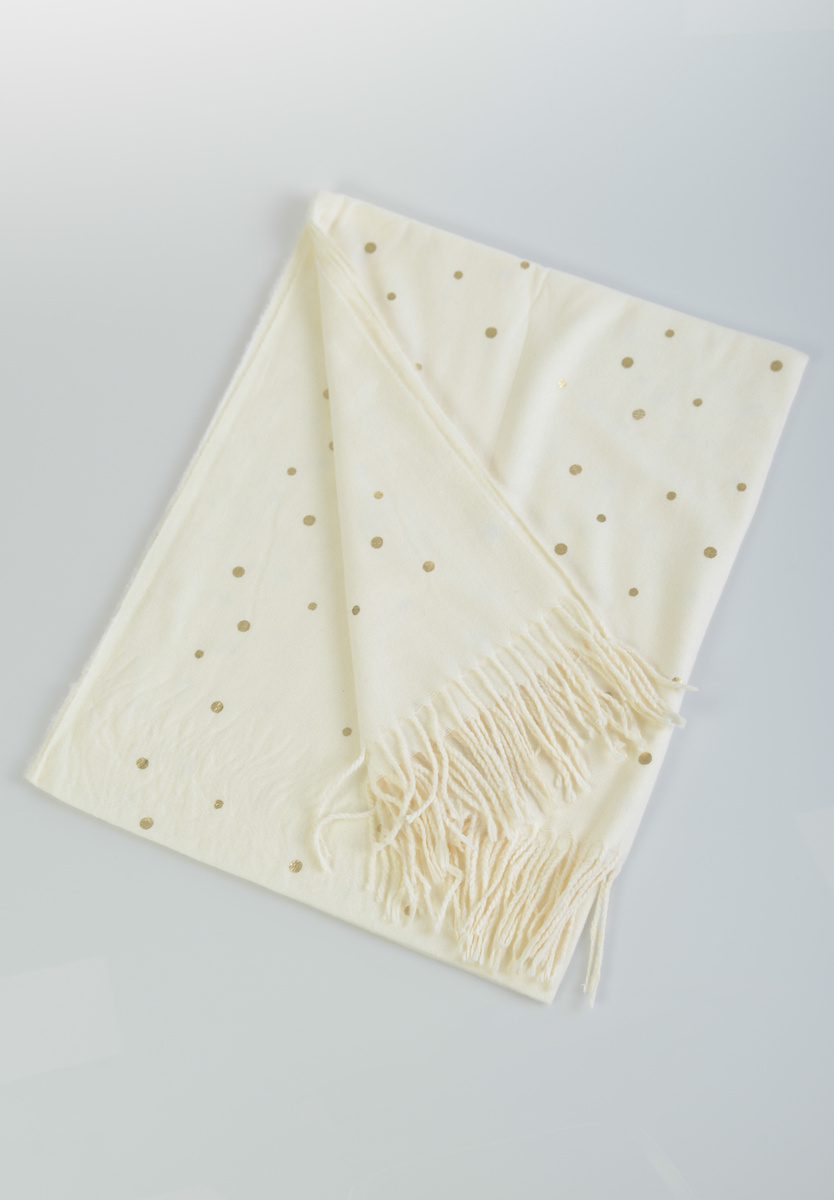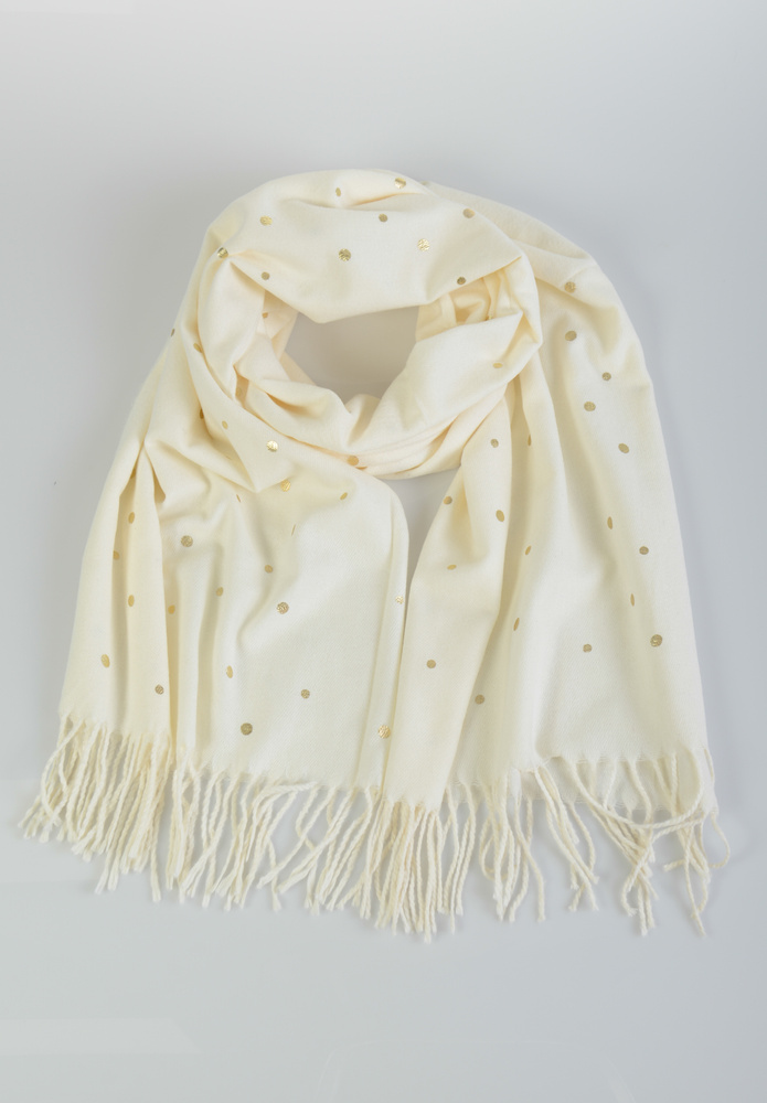 Damski duży szalik. Szal w kolorze ecru. Szal w złote kropki. Szal sprawdzi się idealnie do wielu stylizacji na jesienne oraz zimowe dni. Materiał: 100 % Wiskoza. Wymiary ok. 186 cm x 67 cm.