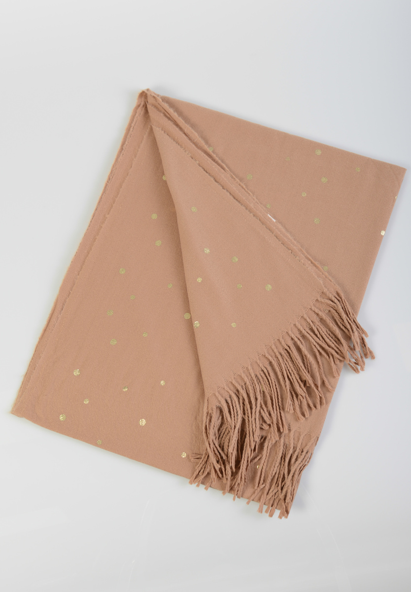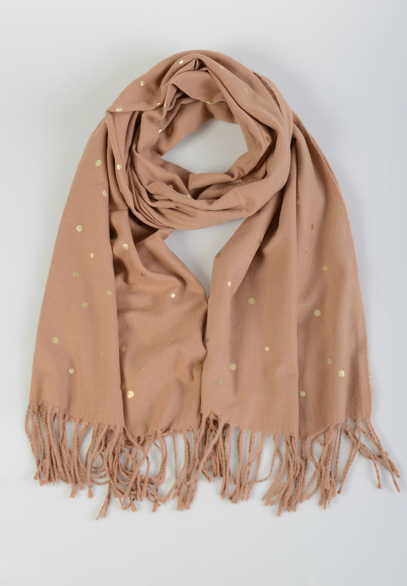 Damski duży szalik. Szal w kolorze brązowym. Szal w złote kropki. Szal sprawdzi się idealnie do wielu stylizacji na jesienne oraz zimowe dni. Materiał: 100 % Wiskoza. Wymiary ok.  186 cm x 67 cm.