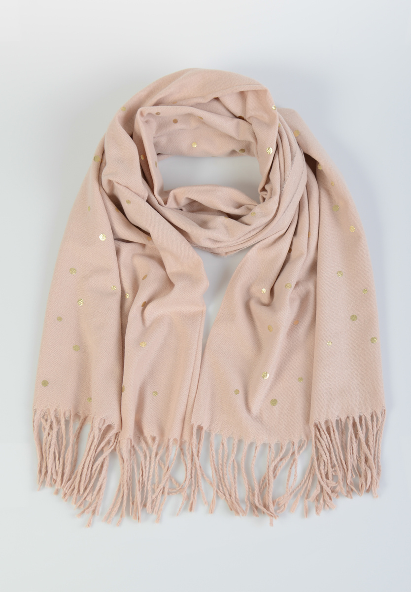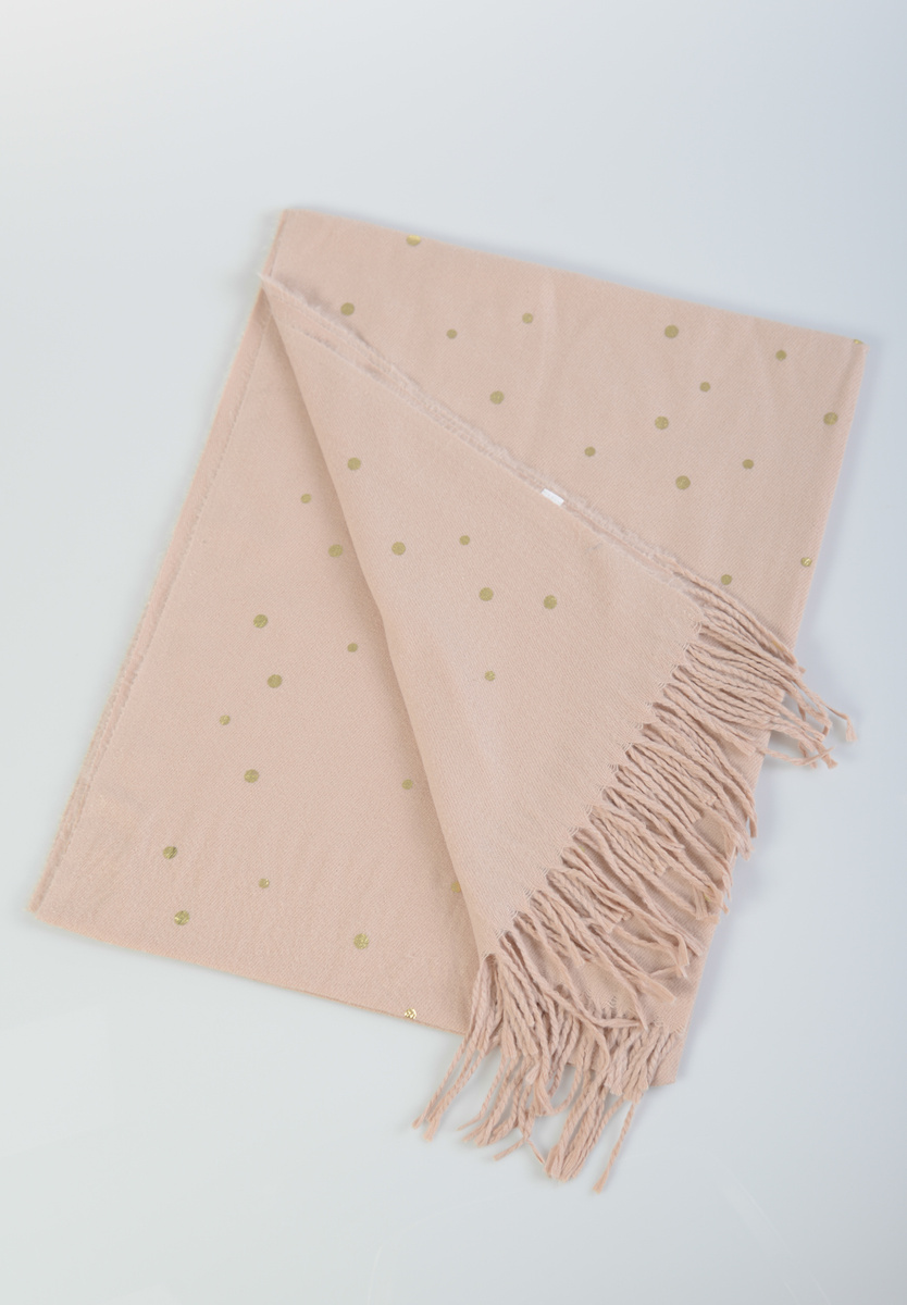 Damski duży szalik. Szal w kolorze beżowym. Szal w złote kropki. Szal sprawdzi się idealnie do wielu stylizacji na jesienne oraz zimowe dni. Materiał: 100 % Wiskoza. Wymiary ok. 186 cm x 67 cm.
