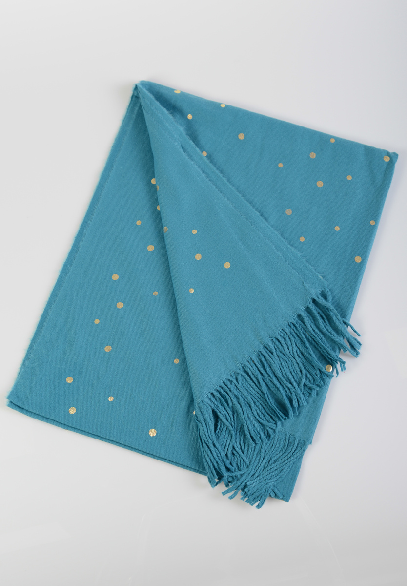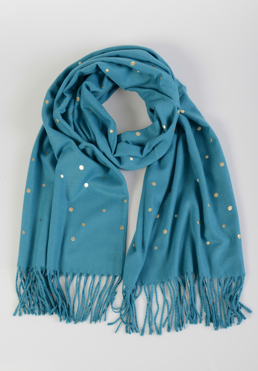 Damski duży szalik. Szal w kolorze turkusowym. Szal w złote kropki. Szal sprawdzi się idealnie do wielu stylizacji na jesienne oraz zimowe dni. Materiał: 100 % Wiskoza. Wymiary ok. 186 cm x 67 cm.