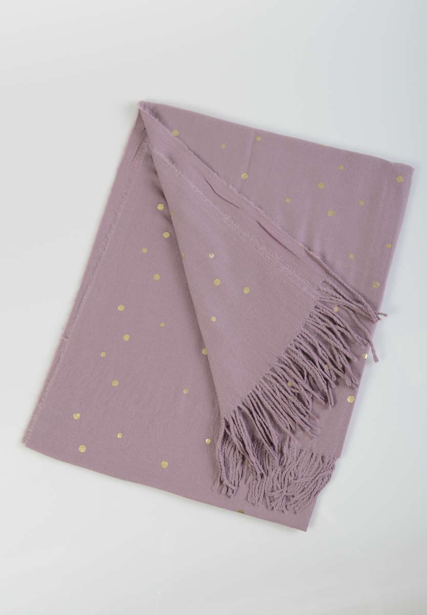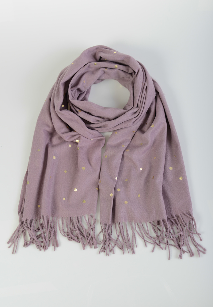 Damski duży szalik. Szal w kolorze fioletowym. Szal w złote kropki. Szal sprawdzi się idealnie do wielu stylizacji na jesienne oraz zimowe dni. Materiał: 100 % Wiskoza. Wymiary ok. 186 cm x 67 cm.