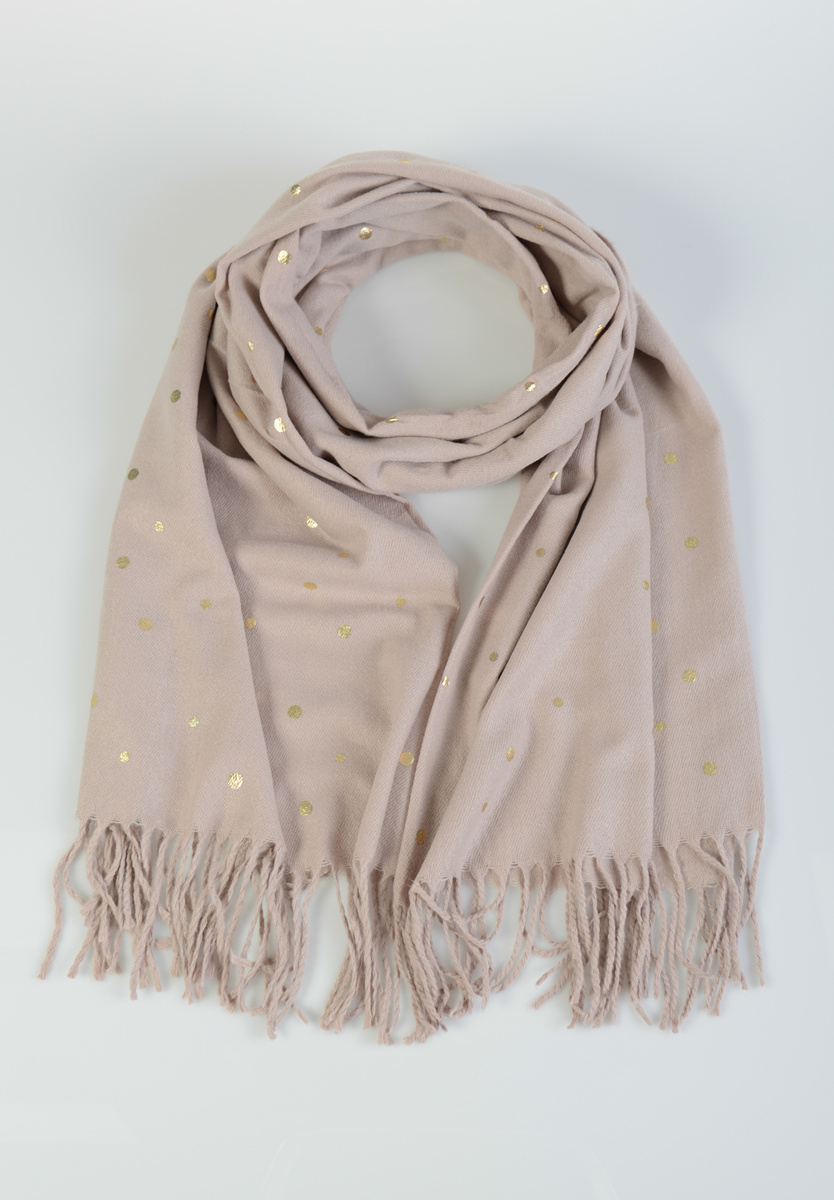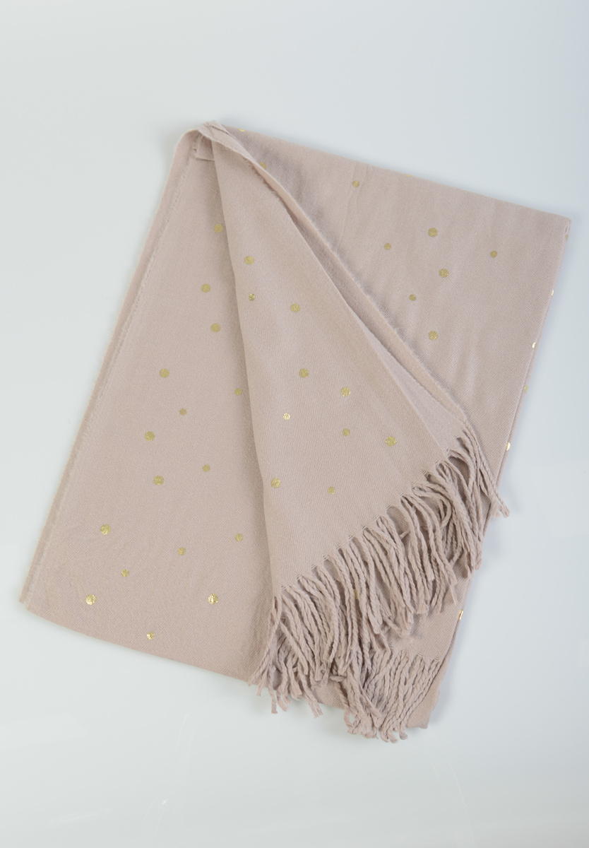 Damski duży szalik. Szal w kolorze jasno beżowym. Szal w złote kropki. Szal sprawdzi się idealnie do wielu stylizacji na jesienne oraz zimowe dni. Materiał: 100 % Wiskoza. Wymiary ok. 186 cm x 67 cm.