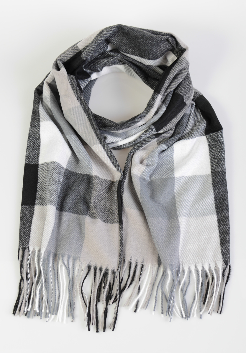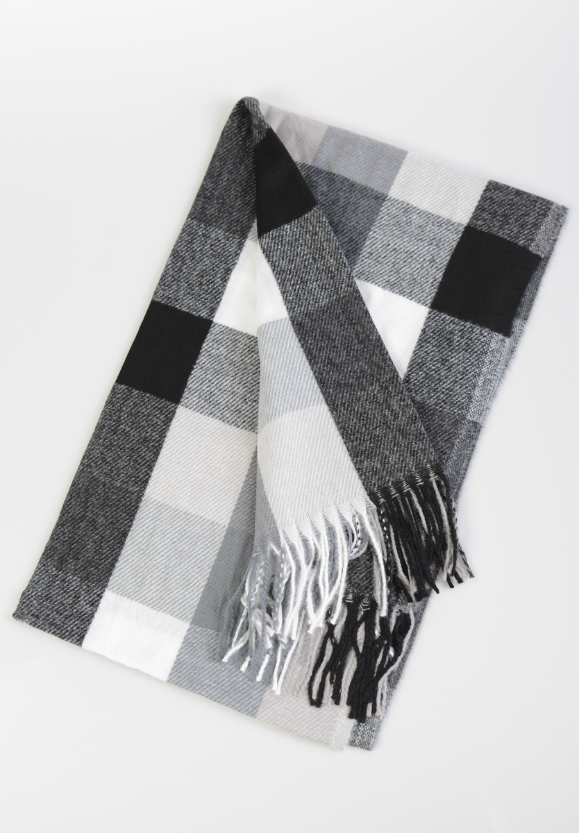 Damski duży szalik. Szal w modną kratę, wielokolorowy w kolorach: szarym, białym i czarnym. Szal sprawdzi się idealnie do wielu stylizacji na jesienne oraz zimowe dni. Materiał: 70% Wiskoza, 30% Wełna. Wymiary ok. 186 cm x 67 cm.