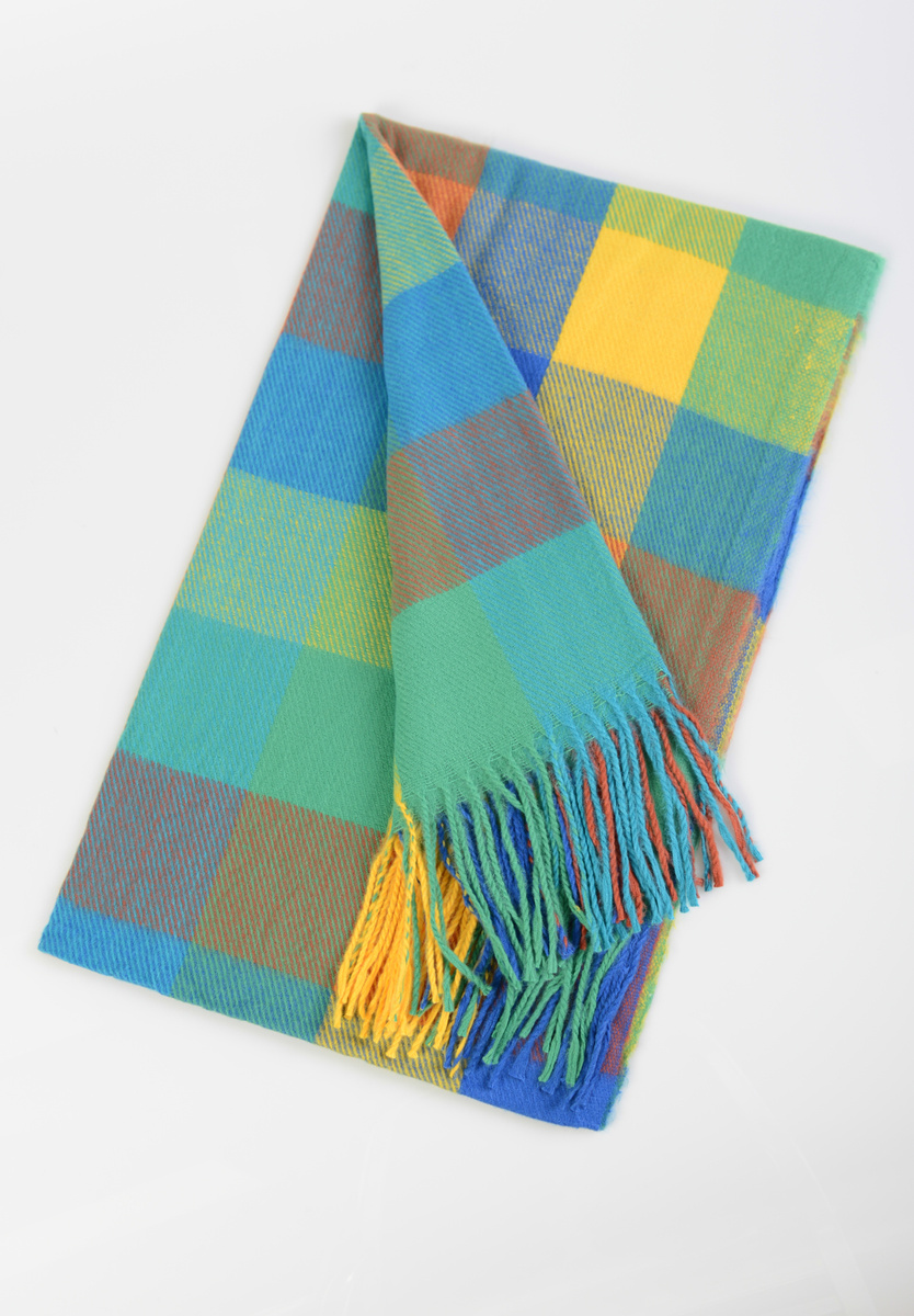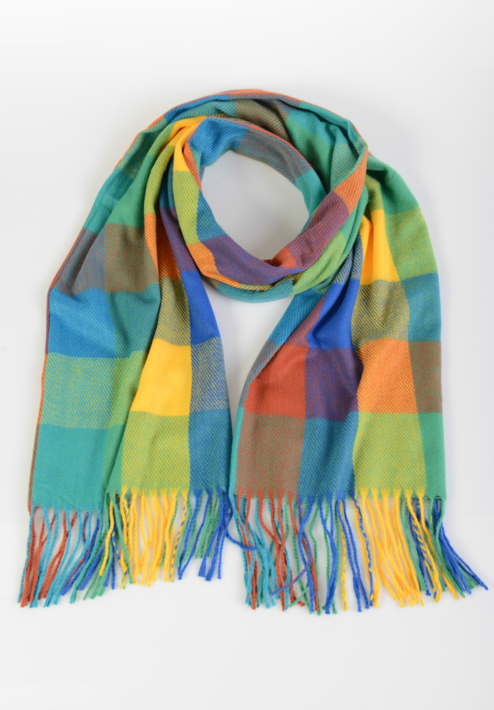 Damski duży szalik. Szal w modną kratę, wielokolorowy w kolorach: żółtym, niebieskim i zielonym. Szal sprawdzi się idealnie do wielu stylizacji na jesienne oraz zimowe dni. Materiał: 70% Wiskoza, 30% Wełna. Wymiary ok. 186 cm x 67 cm.