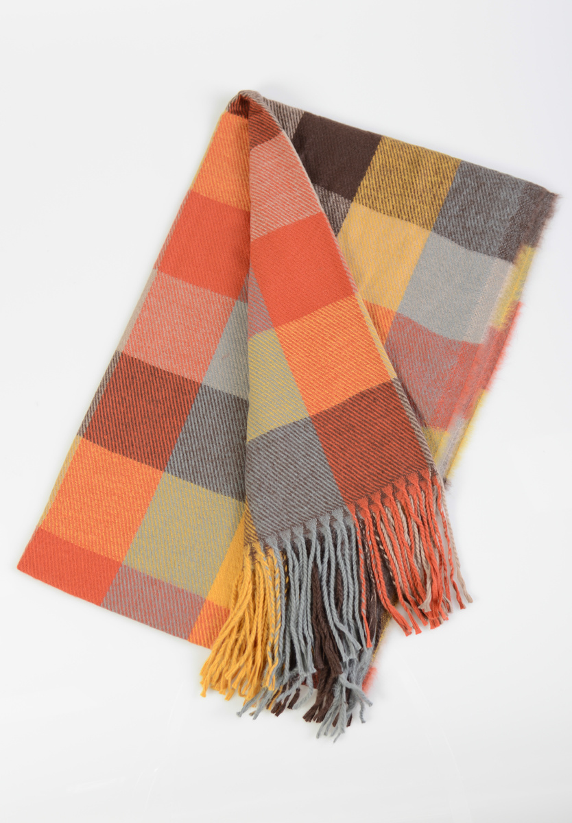 Damski duży szalik. Szal w modną kratę, wielokolorowy w kolorach: brązowym i pomarańczowym. Szal sprawdzi się idealnie do wielu stylizacji na jesienne oraz zimowe dni. Materiał: 70% Wiskoza, 30% Wełna. Wymiary ok. 186 cm x 67 cm.