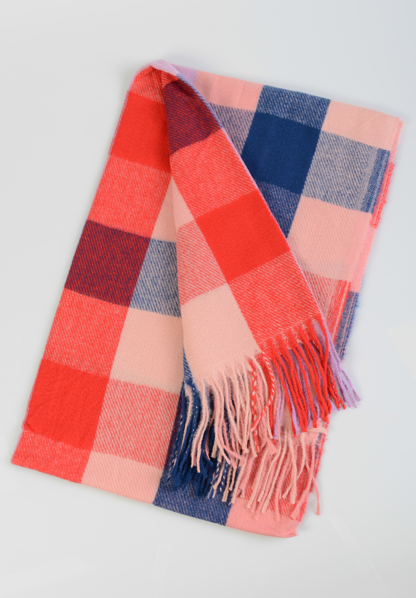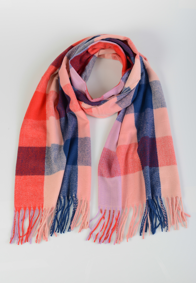 Damski duży szalik. Szal w modną kratę, wielokolorowy w kolorach: granatowym, fioletowym i czerwonym. Szal sprawdzi się idealnie do wielu stylizacji na jesienne oraz zimowe dni. Materiał: 70% Wiskoza, 30% Wełna. Wymiary ok.  186 cm x 67 cm.