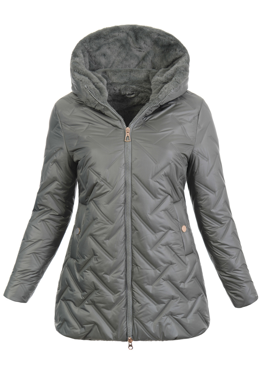 Modna, damska zimowa, pikowana kurtka w kolorze zielonym, wykończona zielonym futerkiem. Kurtka jest zapinana na podwójny suwak. Ocieplona wysokiej jakości wypełnieniem syntetycznym, która zapewnia termoizolację i wysoki komfort użytkowania. Posiada dwie pojemne kieszenie zapinane na napę. Dodatkowo kurtka posiada duży kaptur . Kaptur jest nieodpinany. Kurteczka jest idealnym rozwiązaniem dla osób ceniących sobie wygodę idealna do wielu stylizacji. Tył dłuższy o ok 6 cm.