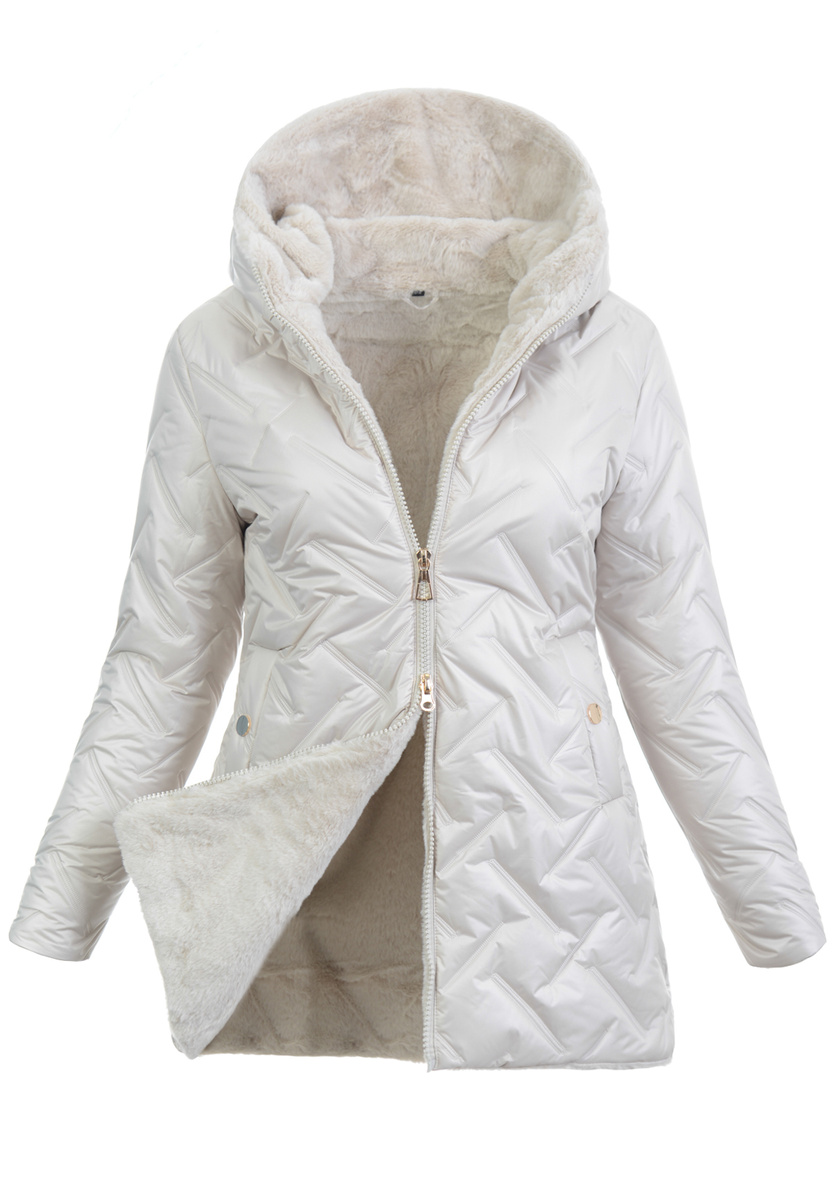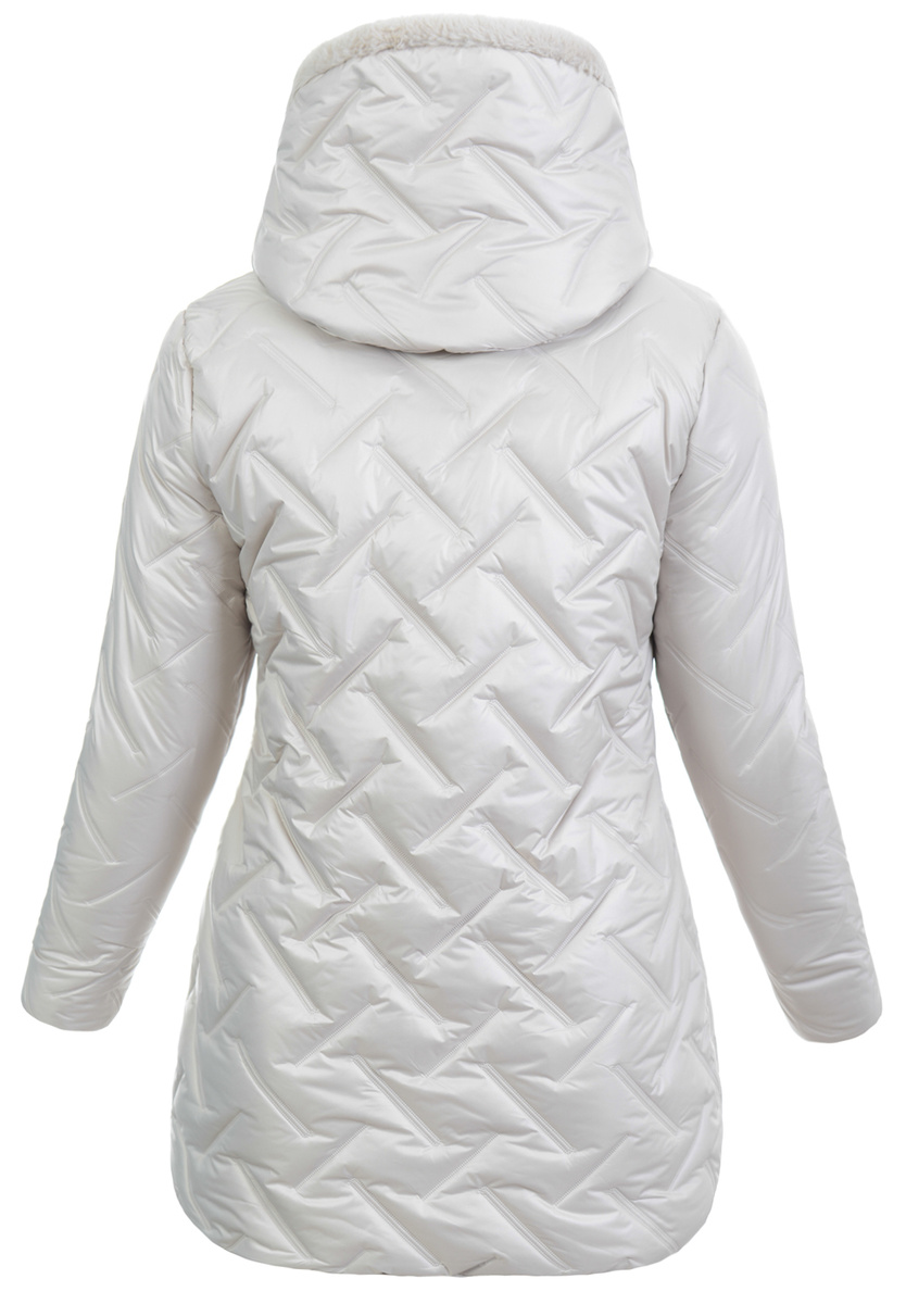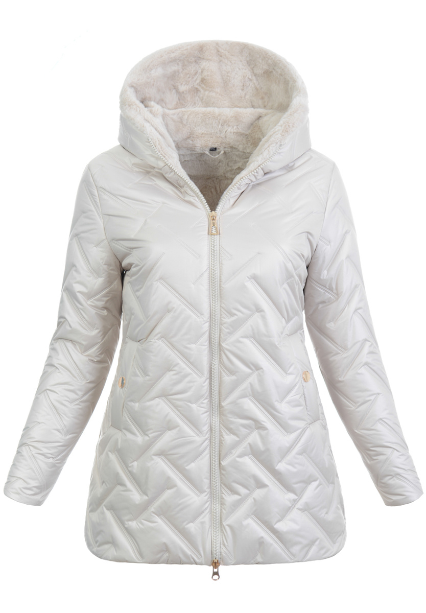 Modna, damska zimowa, pikowana kurtka w kolorze ecru, wykończona kremowym futerkiem. Kurtka jest zapinana na podwójny suwak. Ocieplona wysokiej jakości wypełnieniem syntetycznym, która zapewnia termoizolację i wysoki komfort użytkowania. Posiada dwie pojemne kieszenie zapinane na napę. Dodatkowo kurtka posiada duży kaptur . Kaptur jest nieodpinany. Kurteczka jest idealnym rozwiązaniem dla osób ceniących sobie wygodę idealna do wielu stylizacji. Tył dłuższy o ok 6 cm.