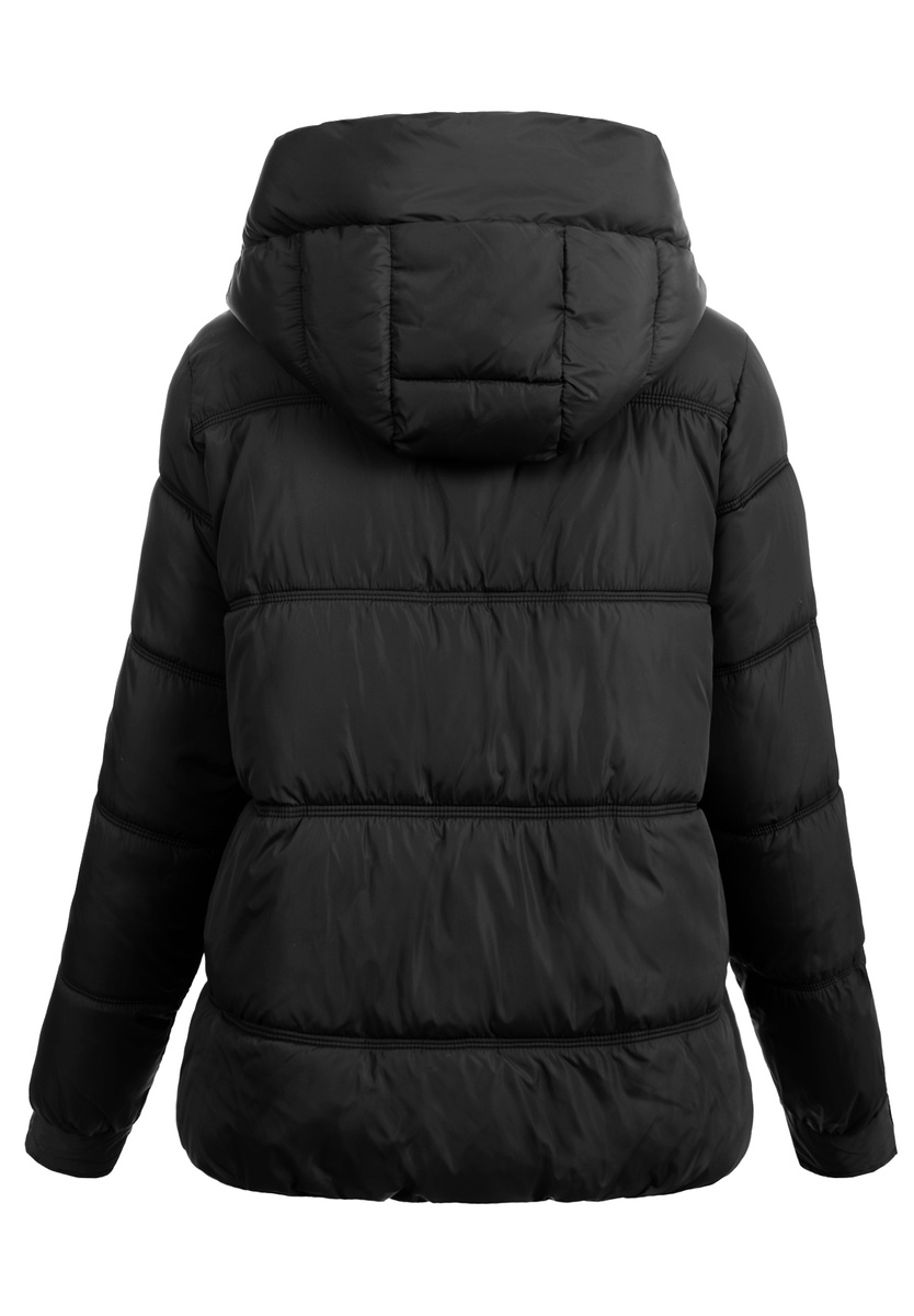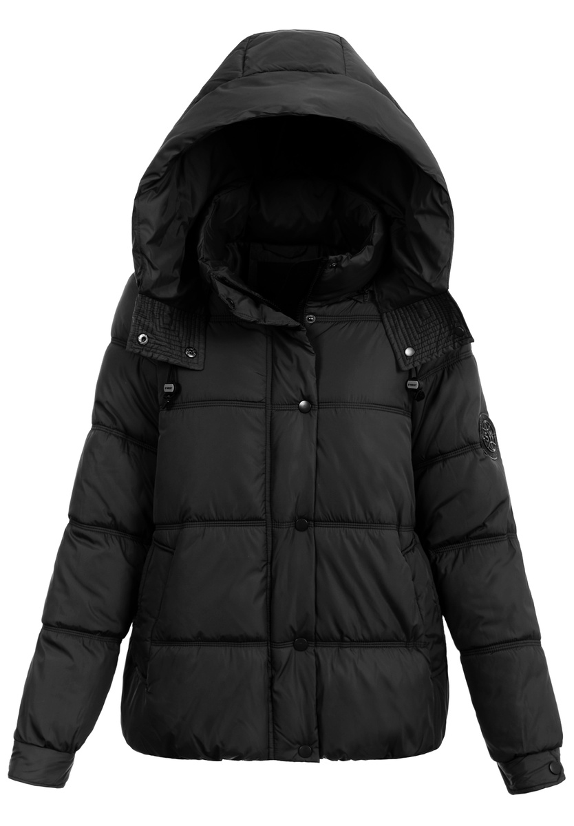 Elegancka, modna damska zimowa kurtka ortalionowa. Kurtka jest w kolorze czarnym, zapinana na suwak oraz napy. Ocieplona wysokiej jakości ociepleniem syntetycznym, który zapewnia termoizolację i wysoki komfort użytkowania. Posiada dwie pojemne kieszenie po bokach. Dodatkowo kurtka posiada odpinany kaptur ze ściągaczem. Dodatkowo w mankietach kurtki znajdują się mankiety zapinane na napę. Kurteczka jest idealnym rozwiązaniem dla osób ceniących sobie wygodę idealna do wielu stylizacji.
