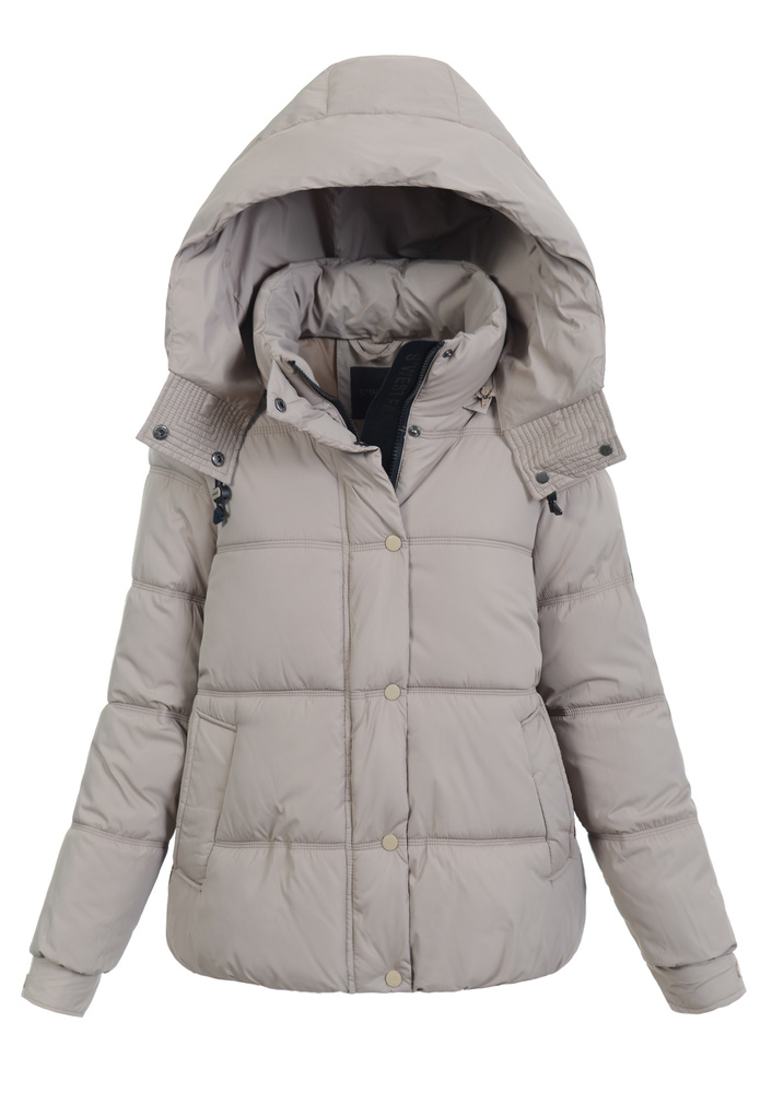 Elegancka, modna damska zimowa kurtka ortalionowa. Kurtka jest w kolorze beżowym, zapinana na suwak oraz napy. Ocieplona wysokiej jakości ociepleniem syntetycznym, który zapewnia termoizolację i wysoki komfort użytkowania. Posiada dwie pojemne kieszenie po bokach. Dodatkowo kurtka posiada odpinany kaptur ze ściągaczem. Dodatkowo w mankietach kurtki znajdują się mankiety zapinane na napę. Kurteczka jest idealnym rozwiązaniem dla osób ceniących sobie wygodę idealna do wielu stylizacji.