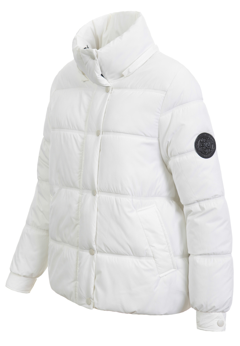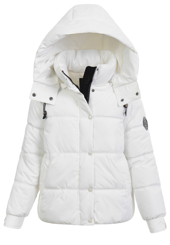 Elegancka, modna damska zimowa kurtka ortalionowa. Kurtka jest w kolorze białym, zapinana na suwak oraz napy. Ocieplona wysokiej jakości ociepleniem syntetycznym, który zapewnia termoizolację i wysoki komfort użytkowania. Posiada dwie pojemne kieszenie po bokach. Dodatkowo kurtka posiada odpinany kaptur ze ściągaczem. Dodatkowo w mankietach kurtki znajdują się mankiety zapinane na napę. Kurteczka jest idealnym rozwiązaniem dla osób ceniących sobie wygodę idealna do wielu stylizacji.