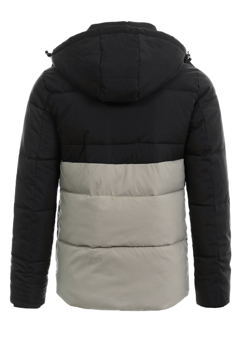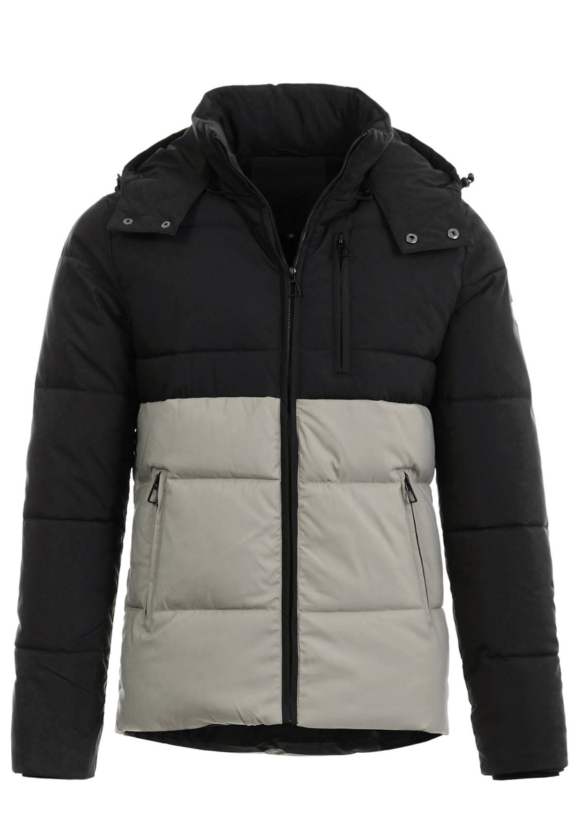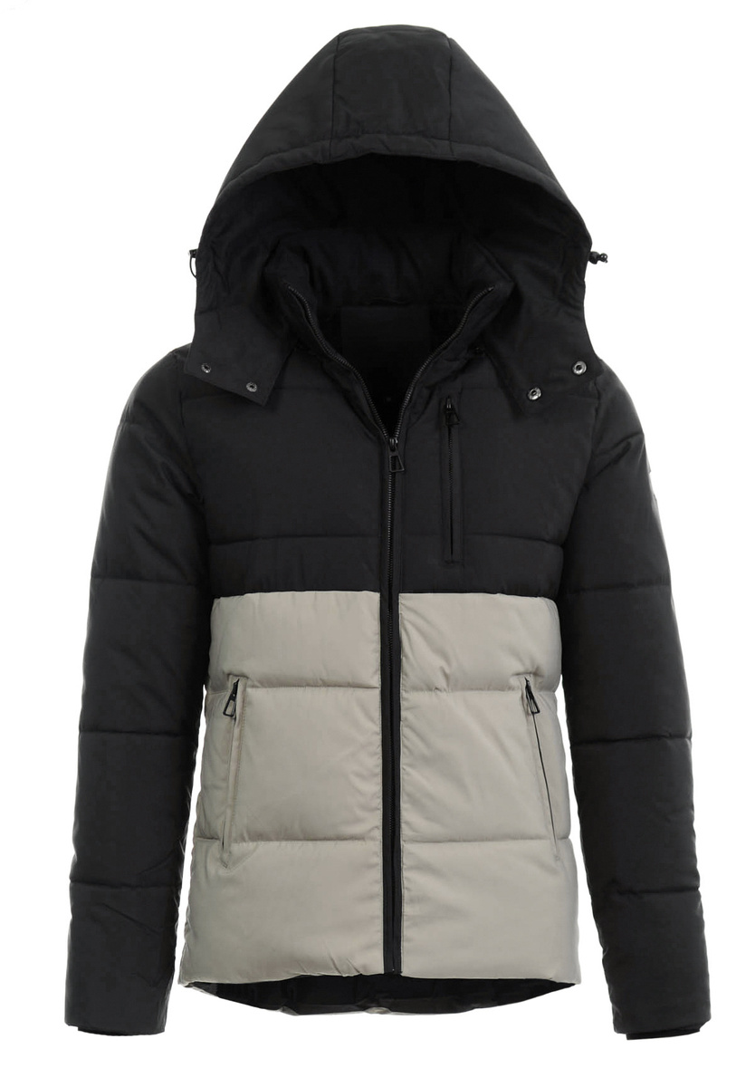 Męska zimowa kurtka dwukolorowa: kremowo-czarna. Zapinana na suwak. Kurtka posiada dwie kieszenie na dole zapinana na suwaki oraz jedna kieszeń na piersi zasuwana na suwak. Odpinany kaptur zapewnia ze ściągaczem ciepło w zimowe, wietrze dni. Kurtka wykonana jest z materiałów najwyższej jakości. Kurtka ocieplona jest bardzo wysokiej jakości wypełnieniem syntetycznym, które zapewnia doskonałą termoizolację oraz wysoki komfort użytkowania. Tył dłuższy o ok 7cm.