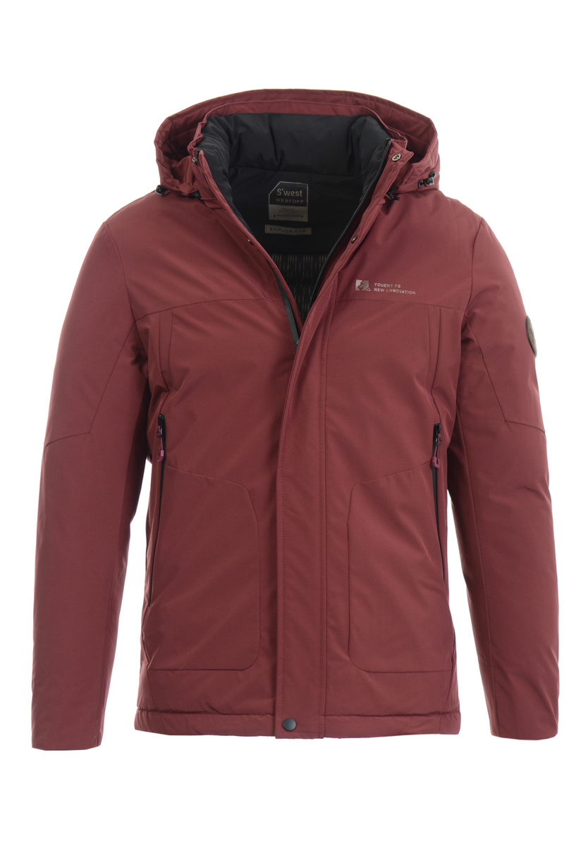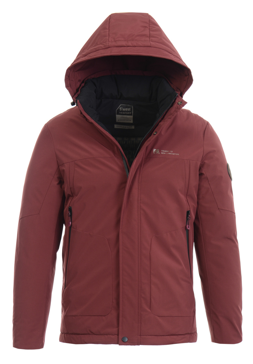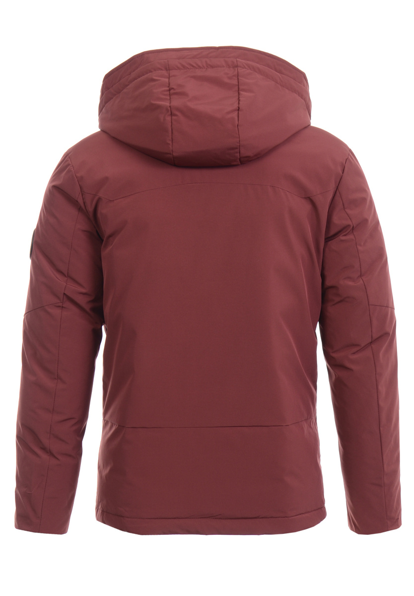 Męska zimowa kurtka bordowa. Zapinana na suwak i napy. Kurtka posiada dwie kieszenie na dole zapinana na suwak. Nieodpinany kaptur ze ściągaczem zapewnia ciepło w zimowe, wietrze dni. Kurtka wykonana jest z materiałów najwyższej jakości. Kurtka ocieplona jest bardzo wysokiej jakości wypełnieniem syntetycznym, które zapewnia doskonałą termoizolację oraz wysoki komfort użytkowania. Mankiety zapinane na rzepę.